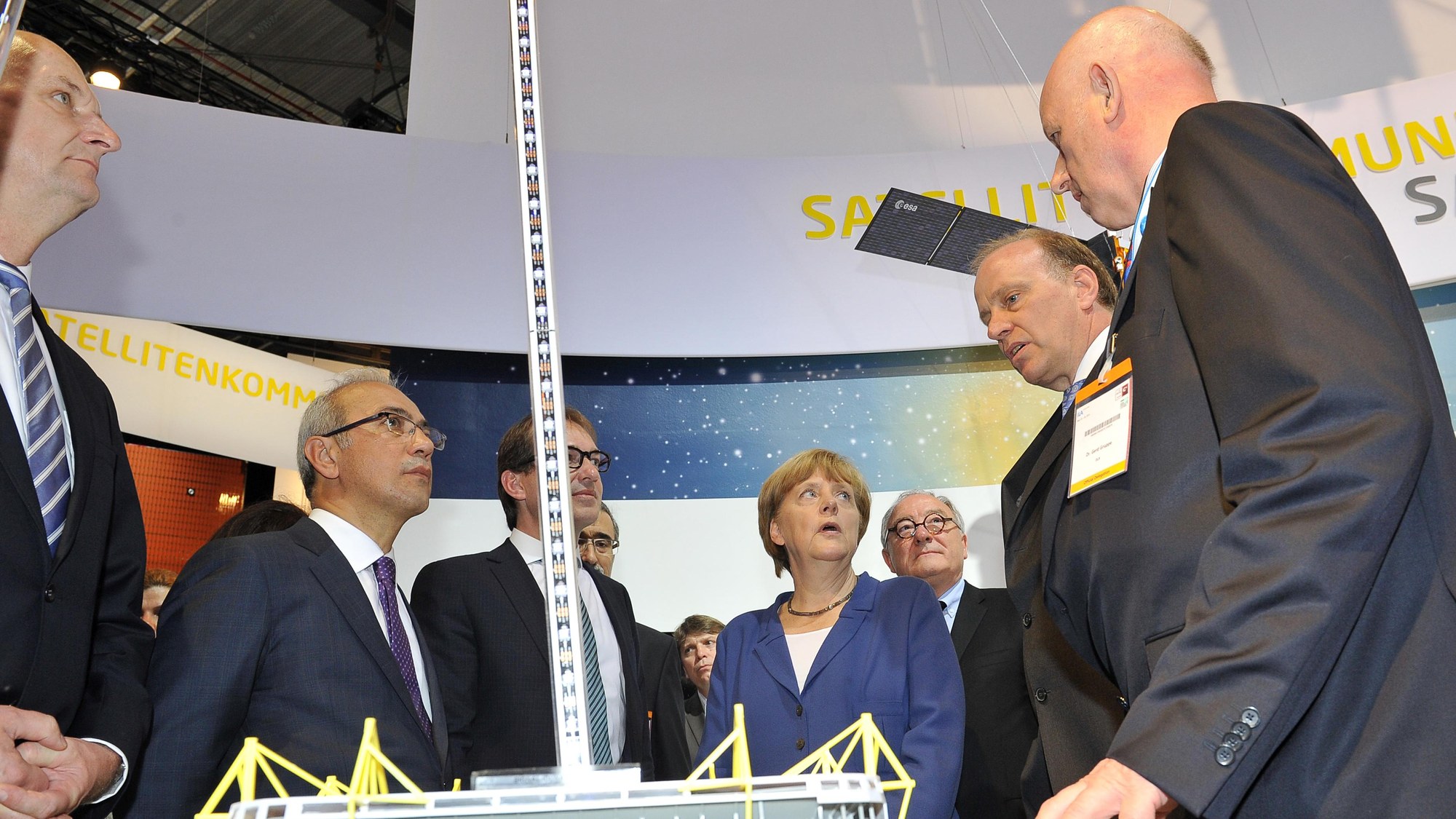 Bundeskanzlerin Angela Merkel informiert sich im Rahmen ihres ILA-Rundgangs 2014 über die Heinrich Hertz-Mission und die Funktionalitäten des Satelliten.
