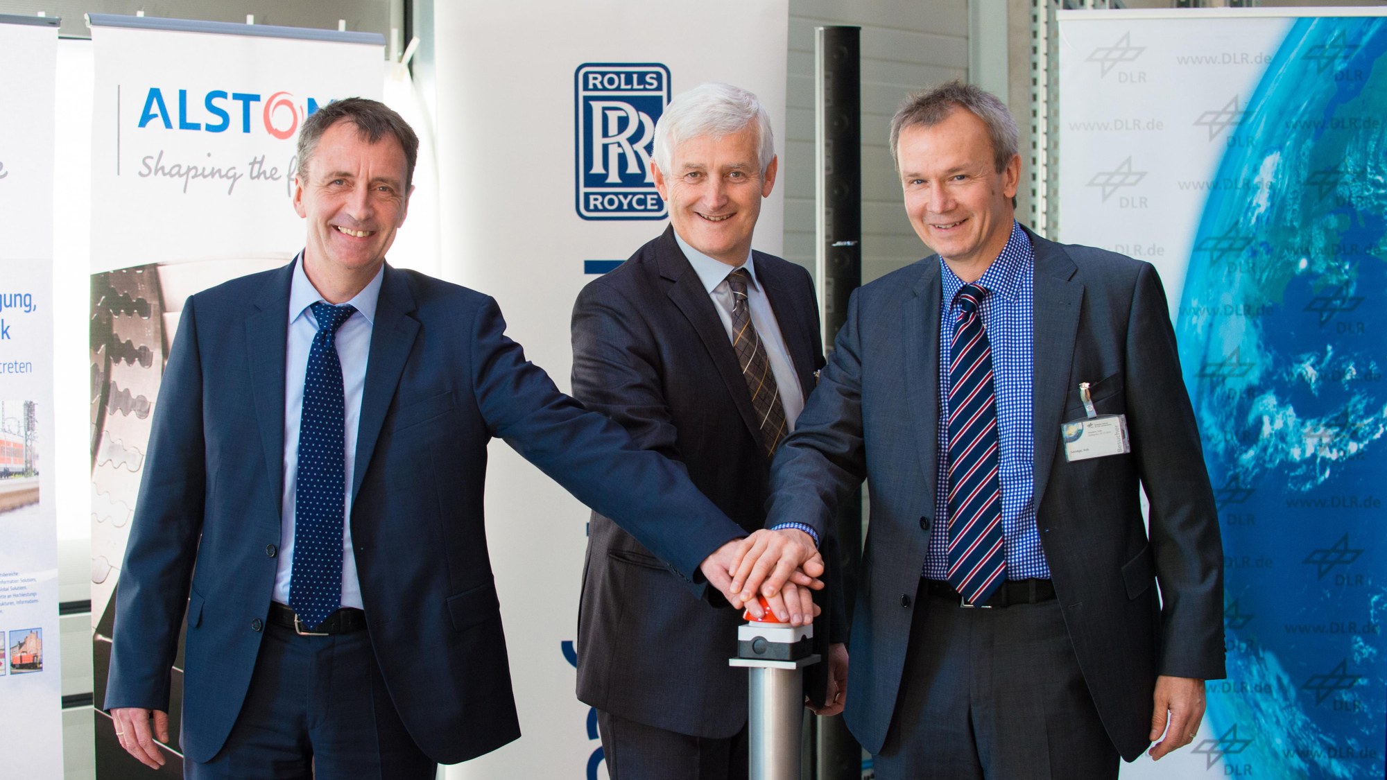 Knopfdruck zur symbolischen Einweihung des Prüfstands, durch Klaus Hamacher (DLR), Charles Soothill (Alstom) und Rob Savidge (Rolls-Royce) (v.l.n.r.)