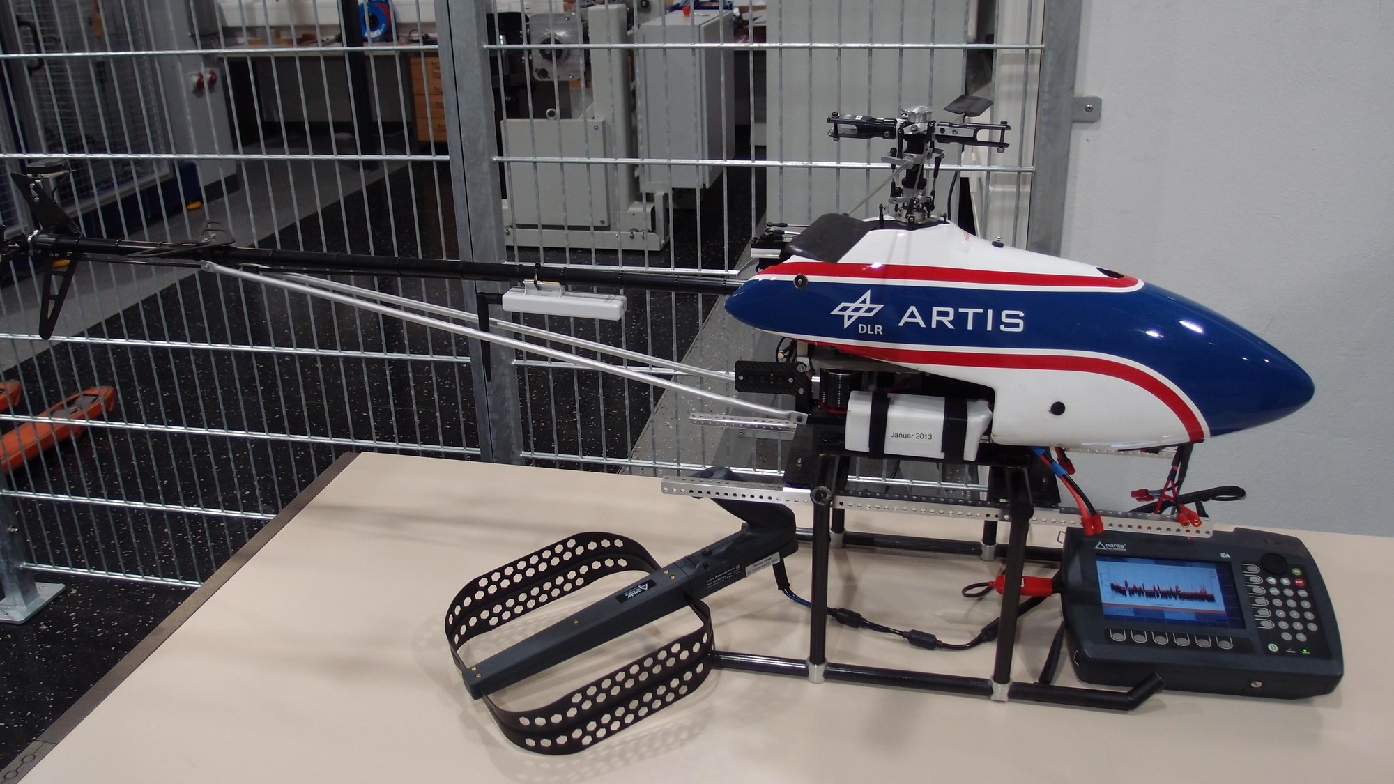 Einer der Hubschrauber der ARTIS-Familie des Instituts für Flugsystemtechnik. Links ist die Rahmenantenne zu sehen, unten rechts der mobile Spectrumanalyser.