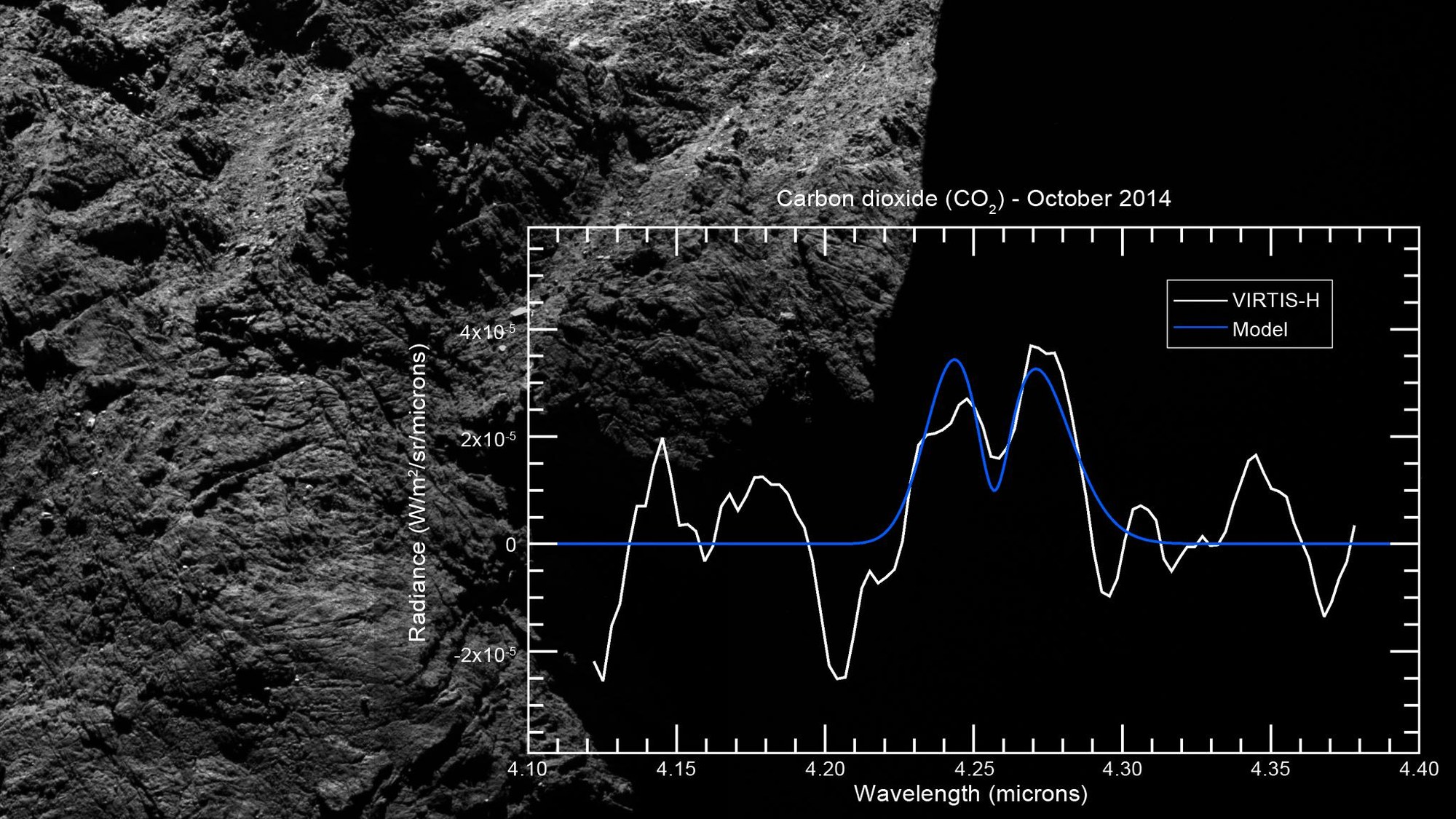 Die Messkurve zeigt die Detektion von Kohlendioxid in der Koma von 67P/Churyumov-Gerasimenko. Die Darstellung zeigt die Messungen (weiß) mit dem Kanal H des Spektrometers VIRTIS auf Rosetta im Vergleich zu Simulationen (Modell, blau), die eine sehr gute Übereinstimmung aufweisen. Die detektierten Molekülbanden zeigen die typische Struktur einer Kombination von Rotationsschwingungslinien. Dieses Gas entweicht mit der Erwärmung des Kometen und dem Beginn seiner Aktivität aus dem Kern.