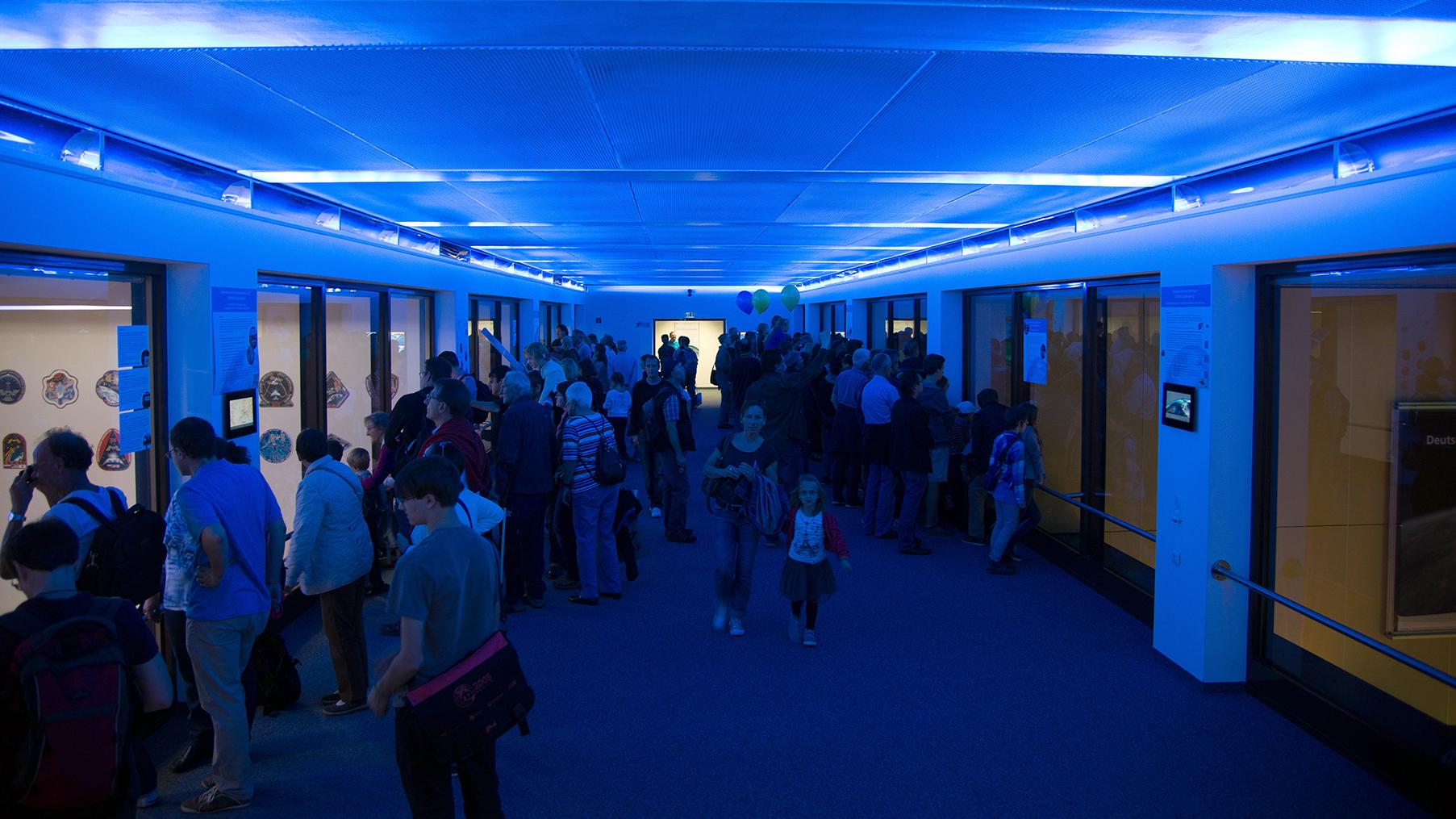 Auf der "Brücke" sieht man direkt in die verschiedenen Kontrollräume: in den Kontrollraum der Radarsatellitenmission TanDEM-X, in den großen Multimissionsraum der für verschiedenen Satellitenmissionen zugleich genutzt werden kann, und in das Kontrollzentrum für das Columbus-Modul der Internationalen Raumstation.