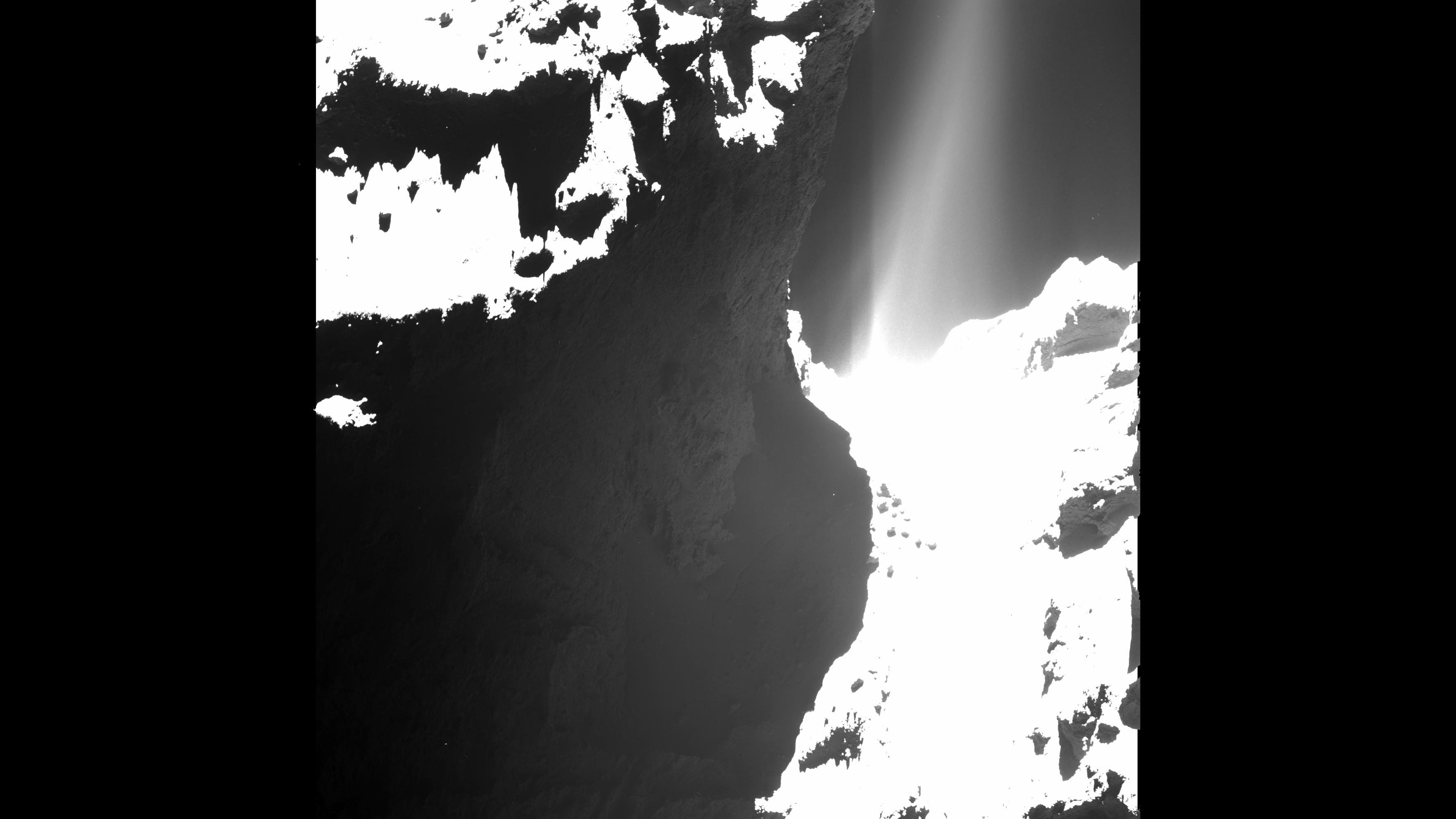 Diese OSIRIS-Aufnahme entstand am 20. Oktober 2014 aus einer Entfernung von 7,2 Kilometern. Sie wurde überbelichtet, um die sogenannten "Jets", die Gasauströmungen mit den mitgerissenen Staubteilchen, sichtbar zu machen.
