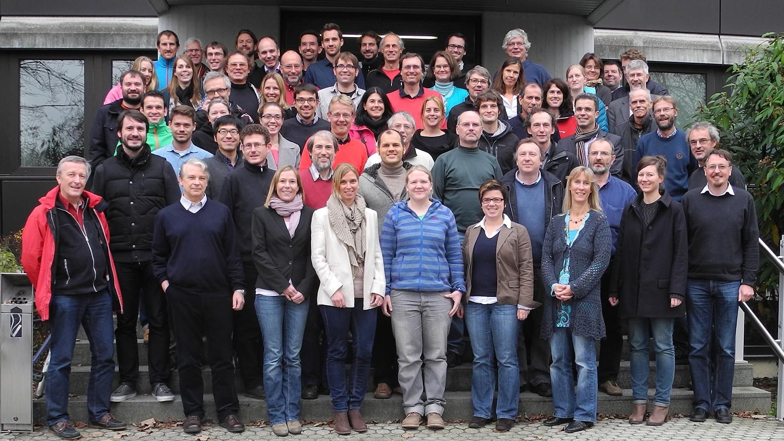 Direktor Markus Rapp (rechte Seite, mit Schal) und 61 Mitarbeiter des Instituts für Physik der Atmosphäre bei der Klausur 2014 auf den Stufen des Vorstandsgebäudes in Oberpfaffenhofen am 21. November 2014.