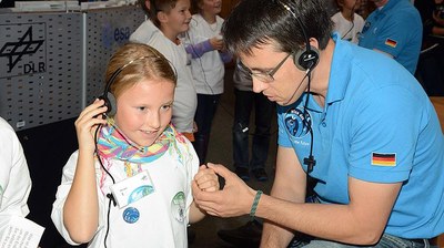 Das war schon ein einmaliges Erlebnis: Konzentriert und auch ein wenig aufgeregt stellt diese Viertklässlerin aus der 4b der Grundschule Alling ihre Frage an den Astronauten Alexander Gerst auf der ISS. Tom Uhlig (rechts), Flugdirektor im Columbus-Kontrollzentrum beim DLR in Oberpfaffenhofen, unterstützt tatkräftig.