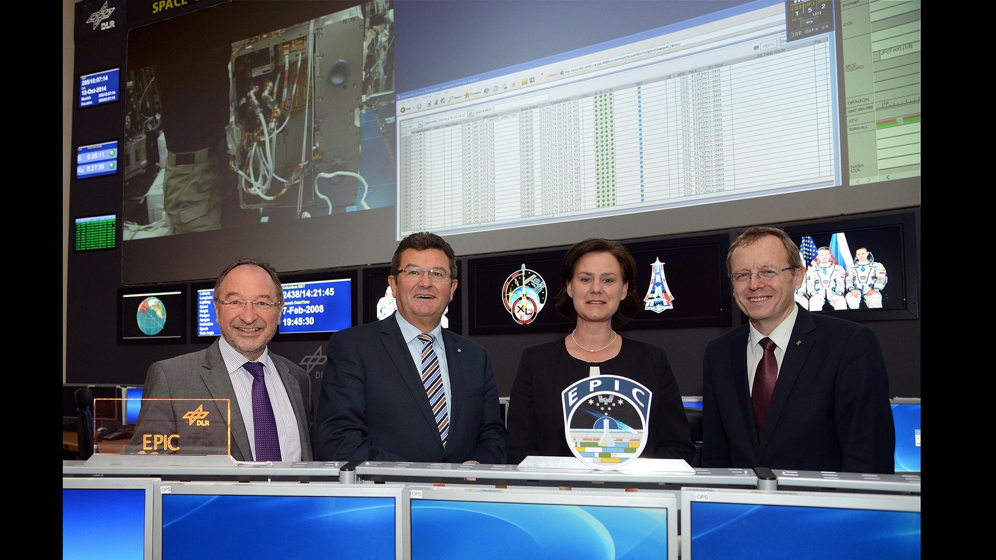 Rundgang des DLR-Vorstandsvorsitzenden Prof. Johann-Dietrich Wörner (rechts) zusammen mit Franz Josef Pschierer (2.v.l.), Staatssekretär im Bayerischen Staatsministerium für Wirtschaft und Medien, Energie und Technologie, Dr. Ute Eiling-Hütig (3.v.l.), Mitglied des Bayerischen Landtags, und Karl Roth (links), Landrat für den Landkreis Starnberg.