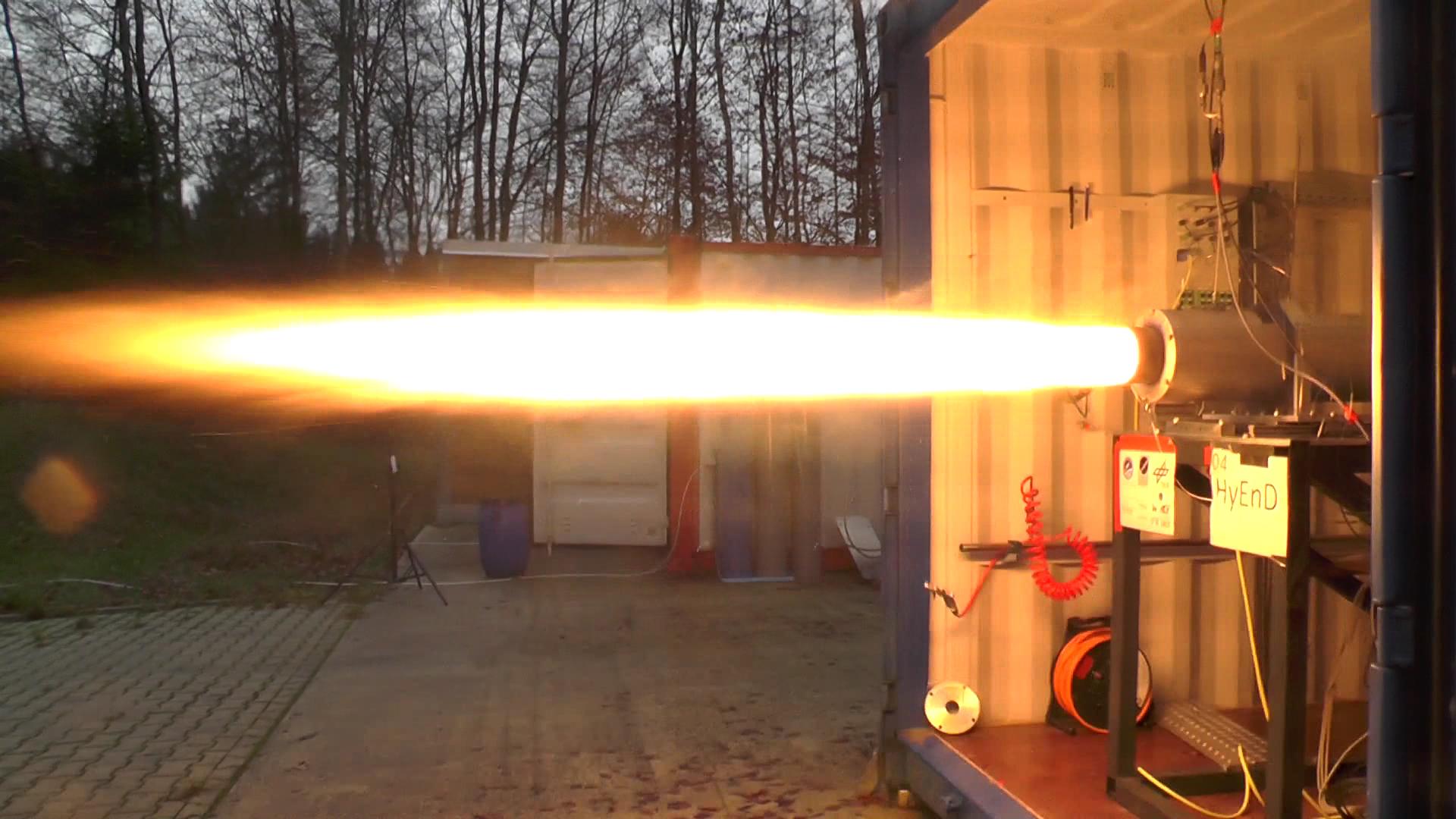 Test eines 10.000-Newton-Triebwerks des HyEnD-STERN-Projekts der Universität Stuttgart auf dem DLR Prüfstand M11.5.