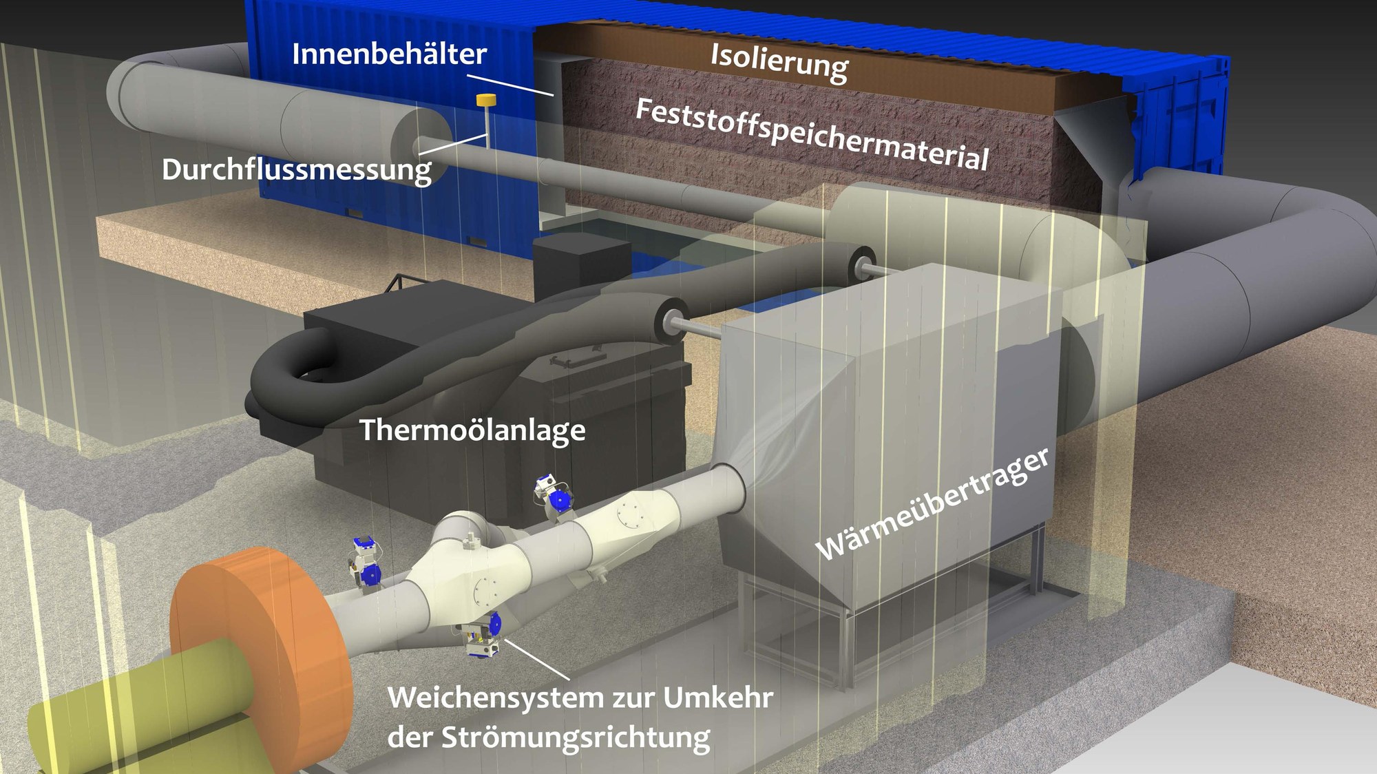 Innerhalb der Module wird die Prozesswärme zunächst mittels eines Wärmeübertragers an ein Zwischenmedium abgegeben – zum Beispiel Luft, Wasser oder Kohlenstoffdioxid. Dieses Zwischenmedium wird dann in einem geschlossenen Kreislauf durch einen Ventilator umgewälzt, strömt (flux) dann durch das feste Speichermaterial und gibt die Wärme weiter.