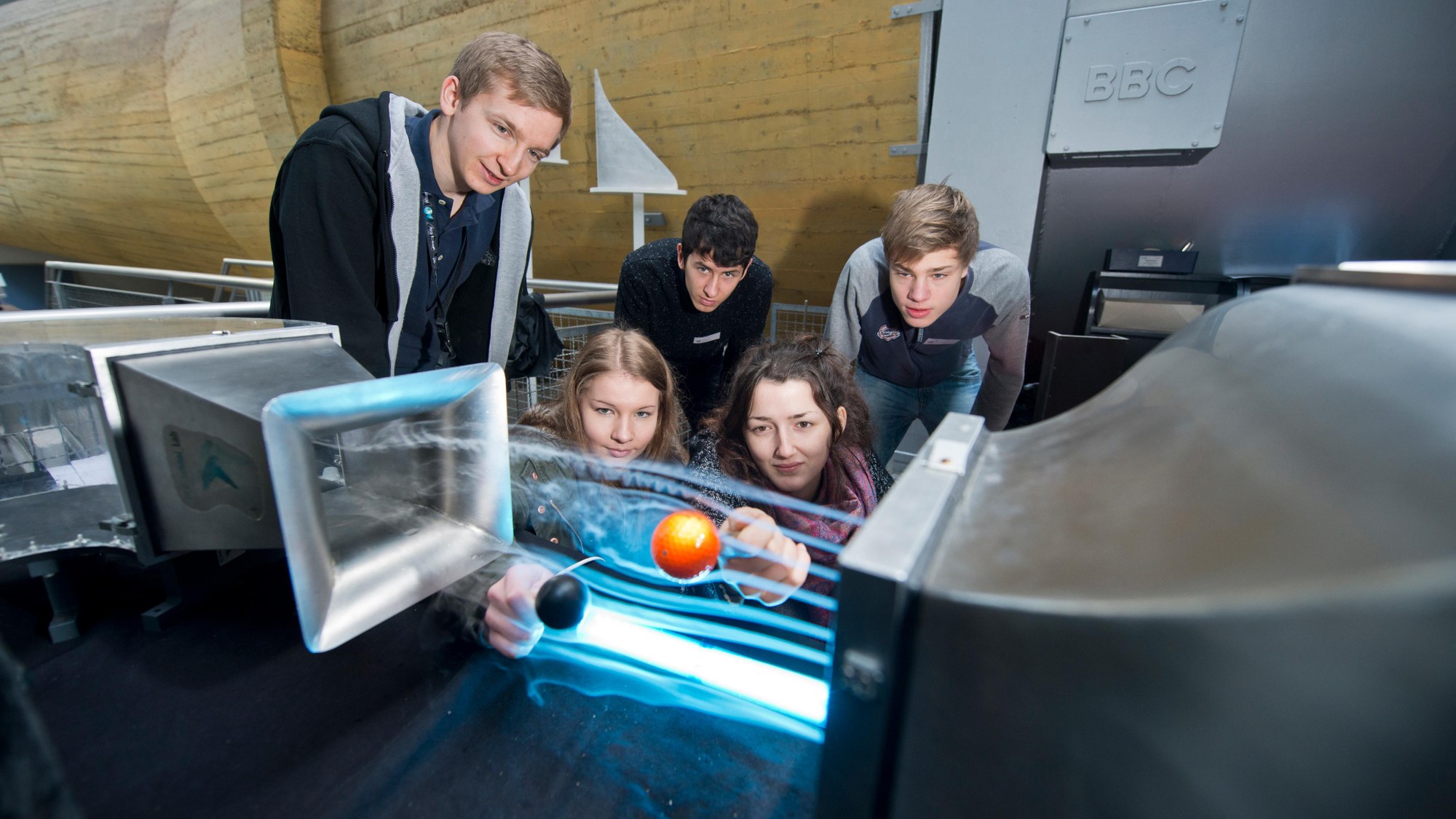 Carolin Bunz, 50.000ste Schülerin im DLR_School_Lab Göttingen (rechts), testet die Wirbelbildung in einem Modell-Windkanal.