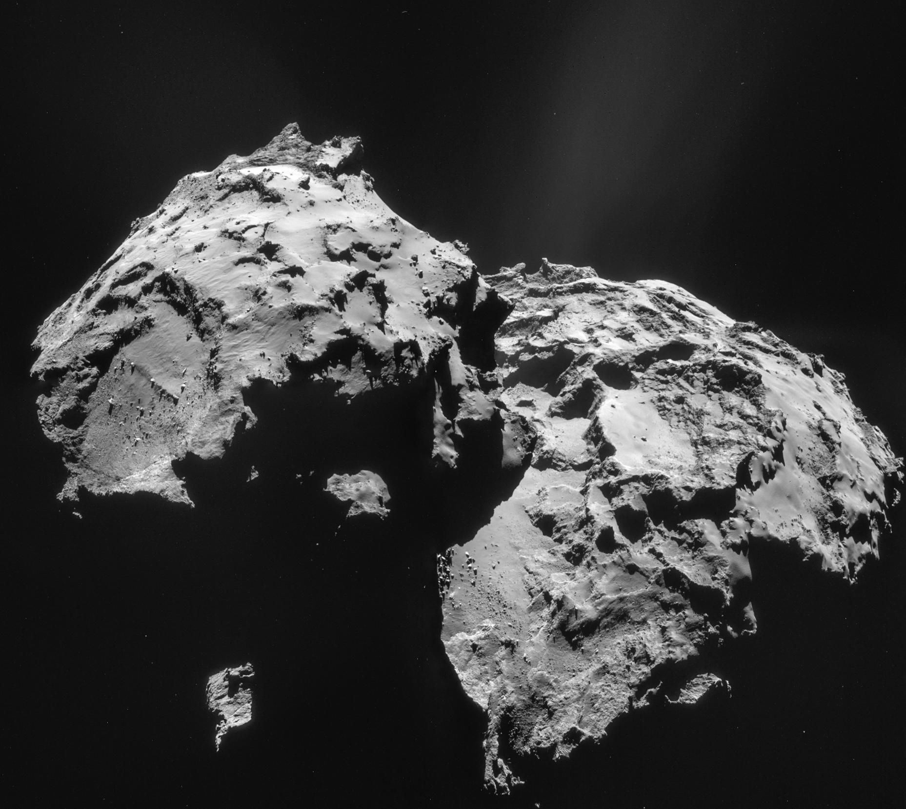 Montage aus vier Einzelaufnahmen, die die Navigationskamera (NavCam) an Bord der Raumsonde Rosetta am 12. Januar 2015 vom Kometen 67P/Churyumov-Gerasimenko gemacht hat. Sie entstanden aus 27,9 Kilometern Entfernung zum Kometen. Die Bildauflösung beträgt 2,4 Meter pro Bildpunkt (Pixel).