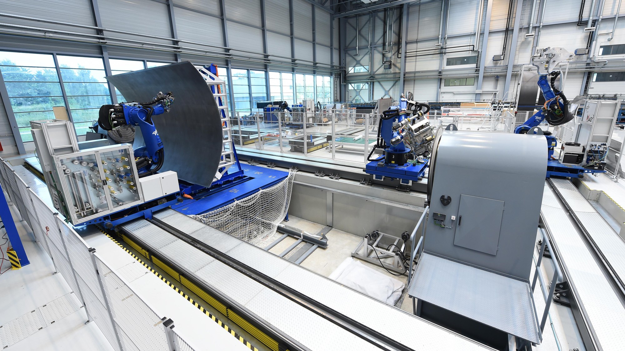 GroFi-Gesamtanlage (GroFi: Großbauteile in Fiber Placement) für hochproduktive Faserablage mit bis zu acht koordiniert arbeitenden Robotern.