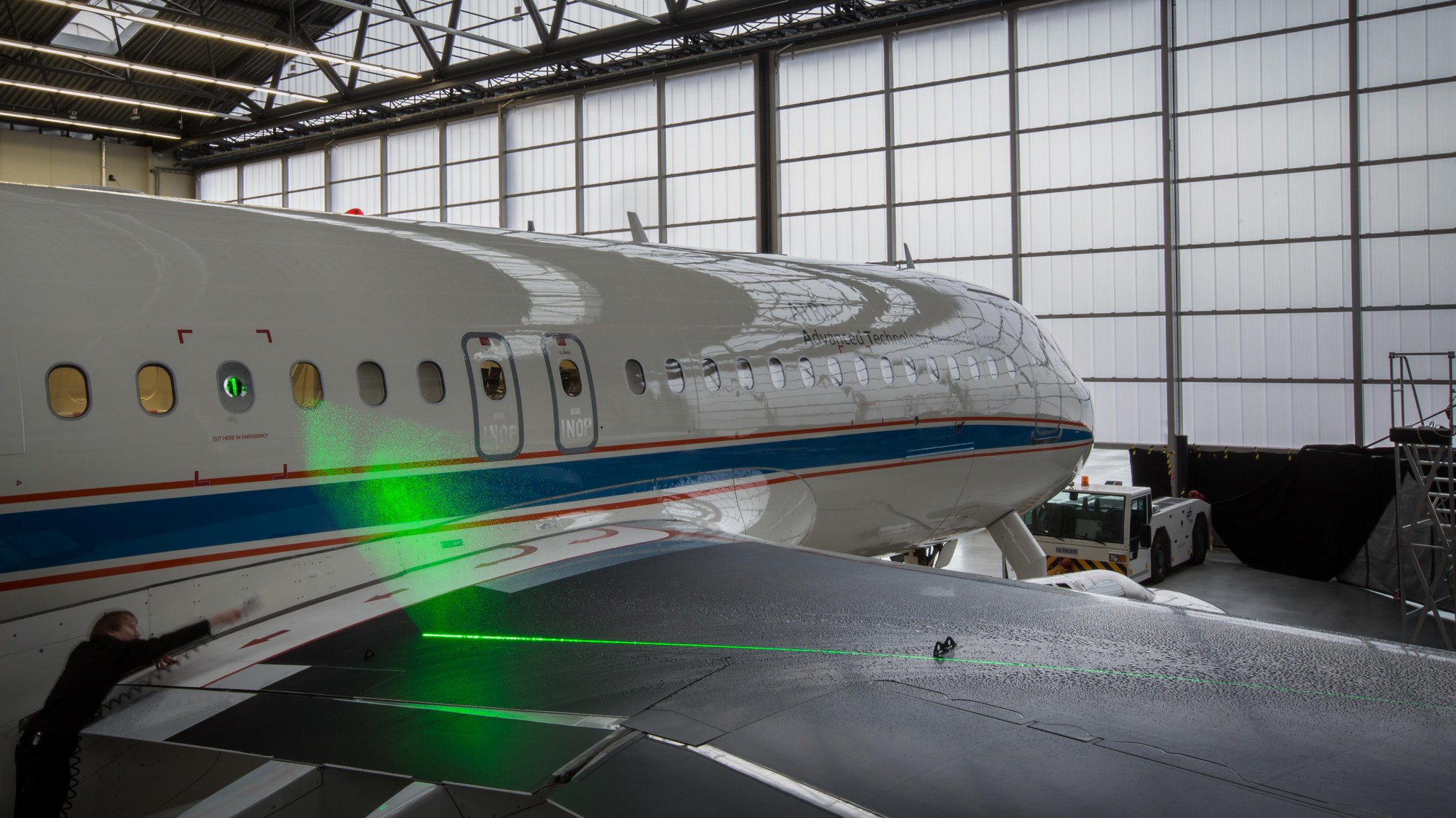 Im Hangar des DLR in Braunschweig erproben die Forscher die Lasermessinstrumentierung über der Tragfläche des Forschungsflugzeugs ATRA. Wassertröpfchen werden im Laserlicht sichtbar und von seitlich hinter den Kabinenfenstern montierten Kameras aufgenommen.