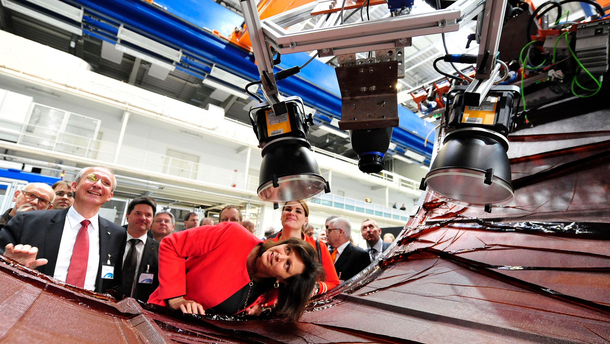 Die multifunktionale Roboterzelle (MFZ) des DLR in Augsburg erlaubt die Entwicklung von Produktionstechnologien für Luft- und Raumfahrtstrukturen im Rahmen einer geschlossenen Prozesskette im Full-Scale-Maßstab. Die neuartige Hang-Down-Konfiguration eröffnet Perspektiven für neue flexible Produktionsabläufe. Im Bild: Ilse Aigner, Bayerische Staatsministerin für Wirtschaft und Medien, Energie und Technologie, wirft einen Blick auf den Qualitätssicherungsroboter in der MFZ.