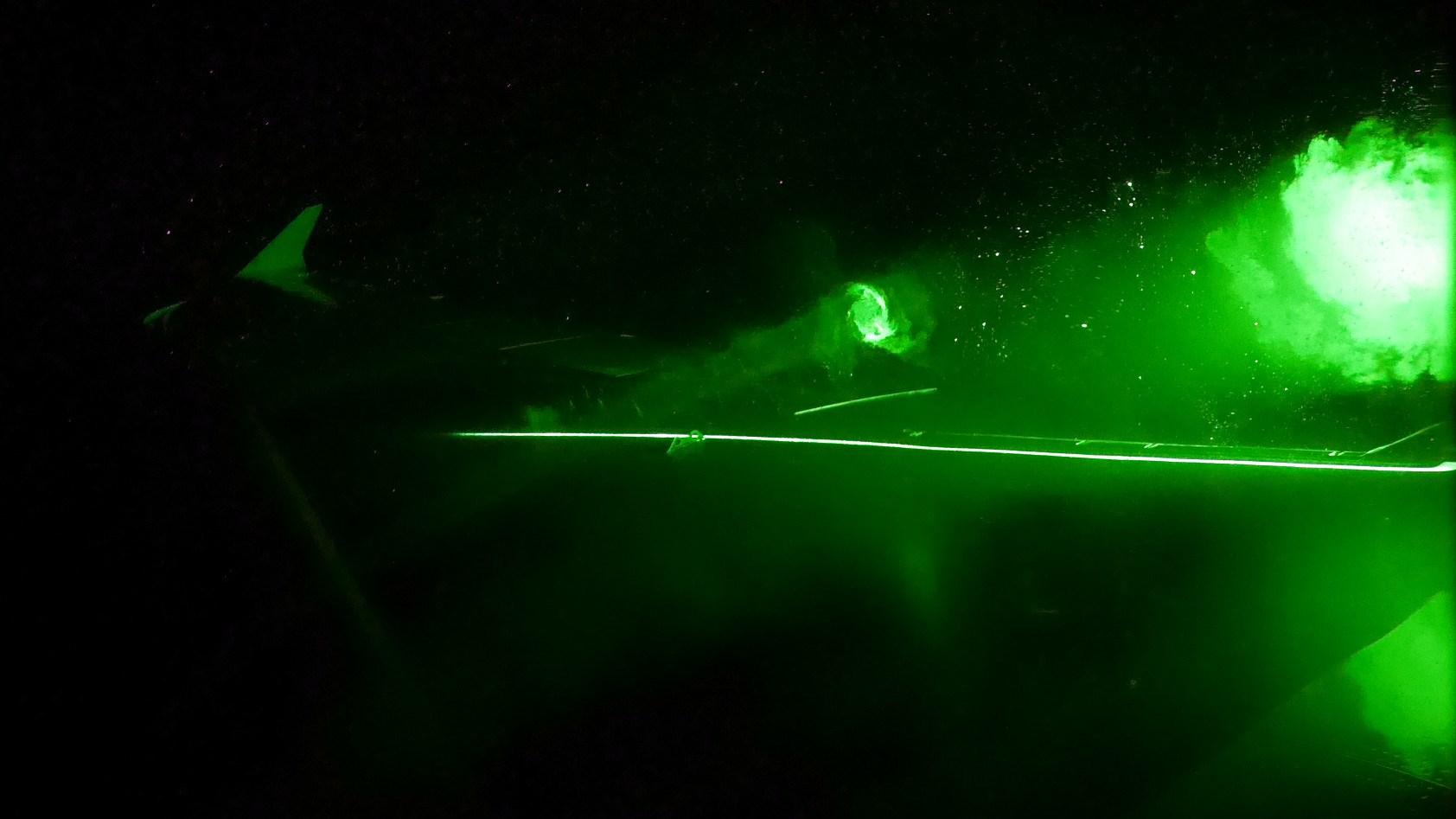 Während des Messfluges zeigen sich Strömungswirbel im Laser-Lichtschnitt über der Tragfläche des ATRA. Die Wirbel erzeugen Kondensation und zeichnen sich deshalb besonders deutlich ab. Ganz links ist die indirekt beleuchtete Flügelspitze mit Winglet (Fencelet) erkennbar. Der helle Strich ist die Auftrefflinie des Lichtschnitts auf der Tragfläche.