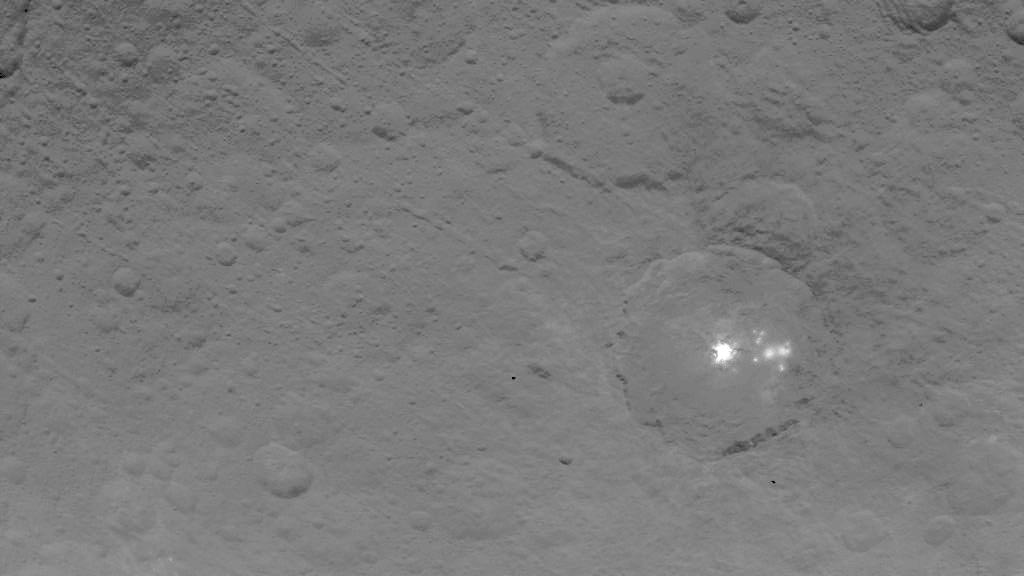 Aufnahmen der Kamera an Bord der Dawn-Sonde zeigen erneut die rätselhaften hellen Flecken auf Zwergplanet Ceres. Auf dem Bild vom 9. Juni 2015 aus 4400 Kilometern Entfernung sind mindestens acht weitere Flecken zu erkennen. Die Auflösung beträgt 410 Meter pro Bildpunkt.