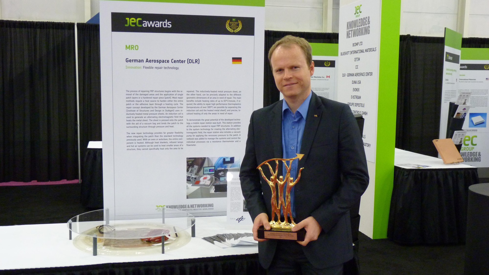 Für das vom DLR-Institut für Bauweisen und Strukturtechnologie entwickelte CFK-Reparaturkonzept nahm DLR-Forscher Markus Kaden Ende Juni 2015 den JEC-Award entgegen