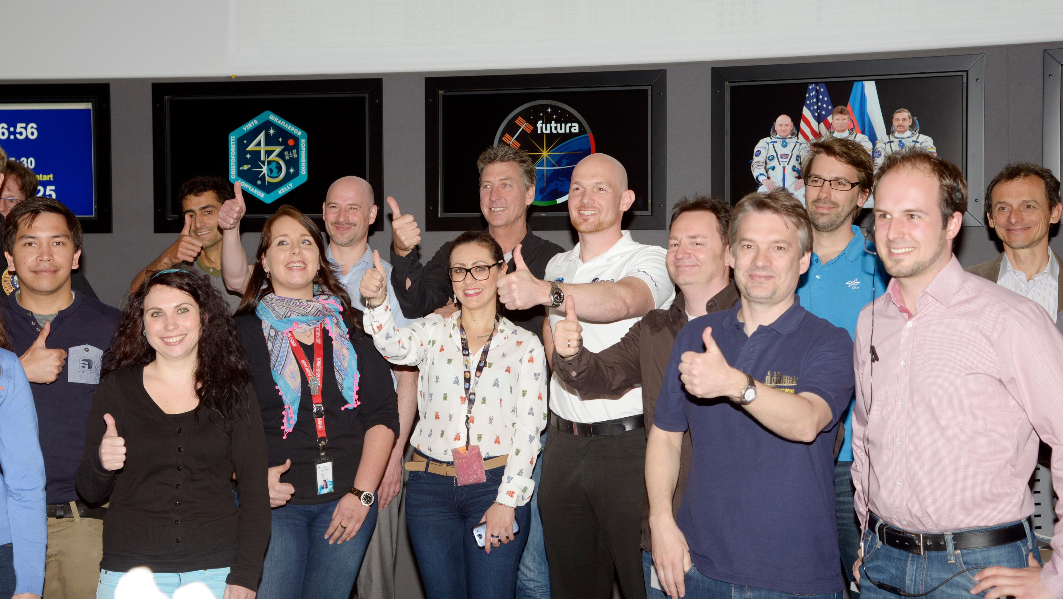Der deutsche ESA-Astronaut Alexander Gerst besuchte am 21. April 2015 das Columbus-Kontrollzentrum im Nationalen Raumfahrtkontrollzentrum (GSOC) des DLR in Oberpfaffenhofen. Im Bild: Alexander Gerst mit dem Columbus-Team im Columbus-Kontrollzentrum.