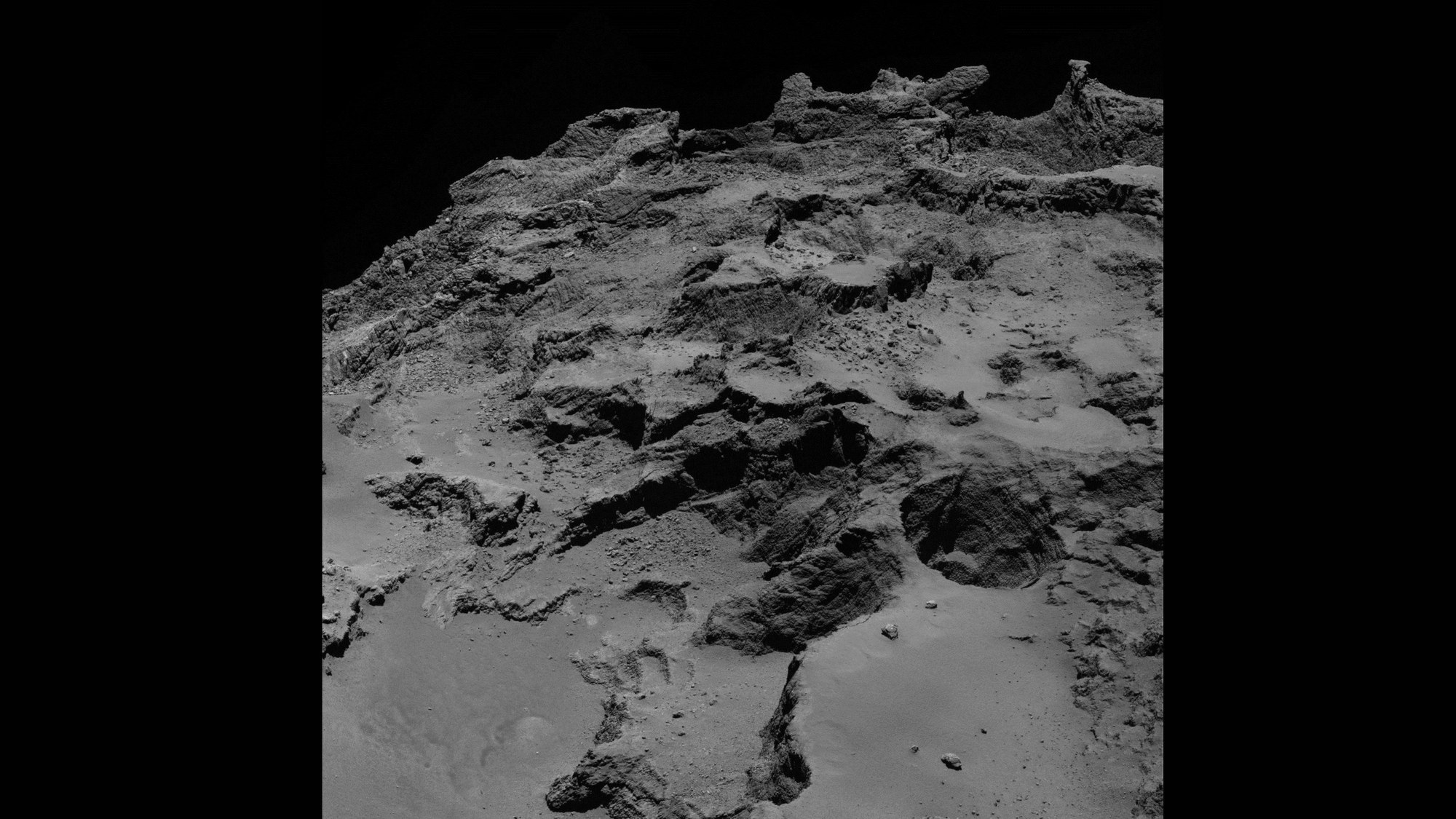 Dieses OSIRIS-Bild wurde von Rosetta am 22. September 2014 aus einer Distanz von 28 Kilometern aufgenommen. Im Vordergrund ist eine weitläufige terrassenförmige Struktur zu erkennen mit einem tiefen Trichter, der einen Blick auf den inneren schichtartigen Aufbau des Kometen freigibt.