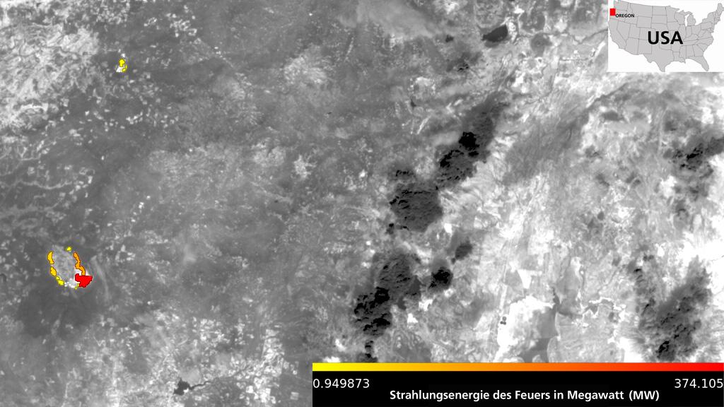 1. August 2015: Das Feuerband hat eine Größe von ca. 9 km x 1 km. Die Strahlungsenergie des Feuers beträgt fast 400 Megawatt.