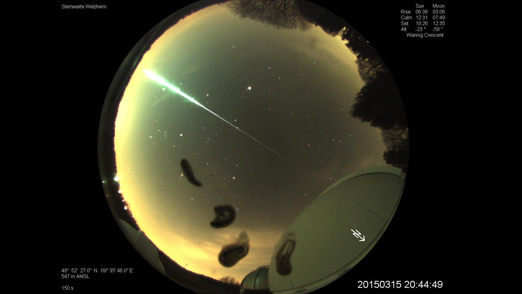 Am Abend des 15. März 2015 registrierten Meteorkameras des DLR-Feuerkugelnetzes einen hellen Meteoriten, der sich von Süddeutschland in Richtung Zentralschweiz bewegte.