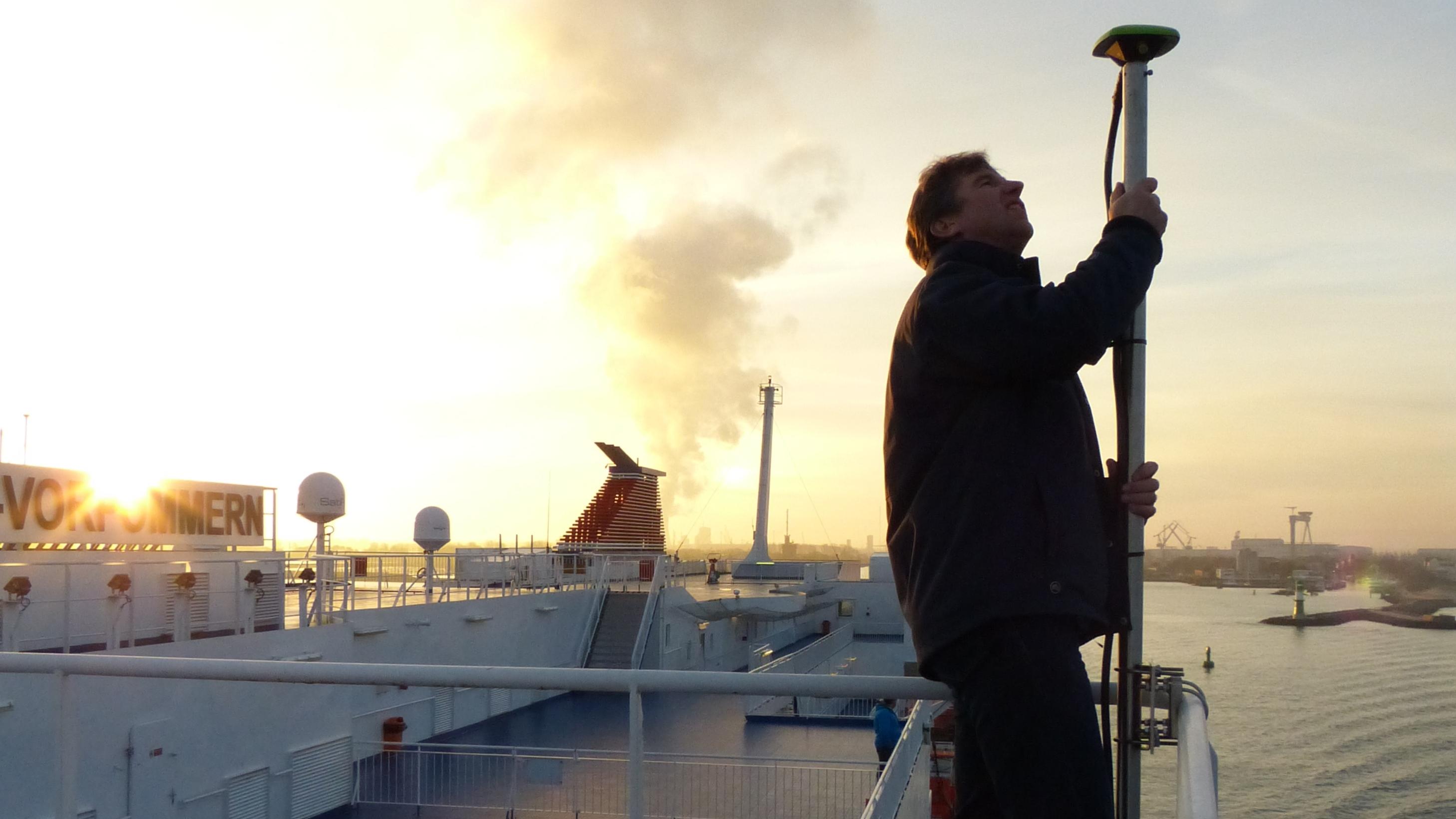 DLR-Projektleiter Ralf Ziebold überprüft eine installierte Antenne. Die Installation des Großteils der Instrumente erfolgte während voller Fahrt.