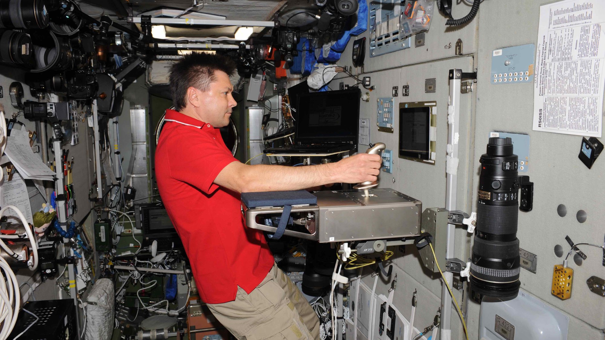 Während die Internationale Raumstation ISS über Europa fliegt, steuert Kosmonaut Oleg Kononenko mit dem Kontur-2-Joystick des Deutschen Zentrums für Luft- und Raumfahrt (DLR) den Roboter ROKVISS im DLR-Labor in Oberpfaffenhofen.