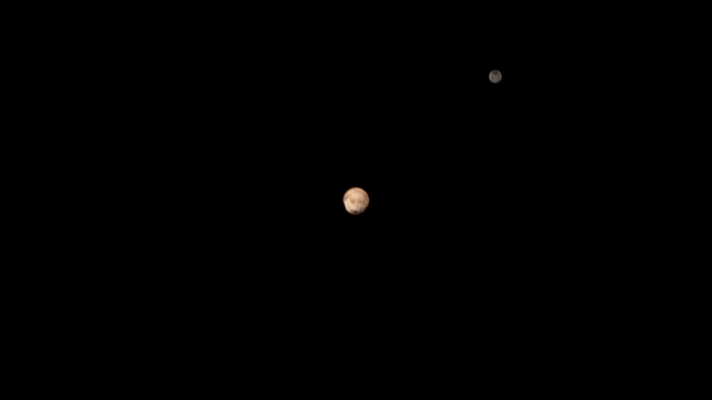 Am 14. Juli 2015 wird die NASA-Sonde New Horizons den Zwergplaneten Pluto erreichen. Bereits aus 15 Millionen Kilometern Entfernung zeigen die Aufnahmen des Teleskops LORRI an Bord von New Horizons, die mit Farbinformationen des Kamerasystems Ralph kombiniert wurden, überraschend viele Details auf der Oberfläche von Pluto und seinem Begleiter, dem Mond Charon. Pluto hat einen Durchmesser von etwa 2380 Kilometern, Charon von etwa 1200 Kilometern. Die Bilddaten wurden zwischen dem 23. und 29. Juni 2015 aufgenommen.