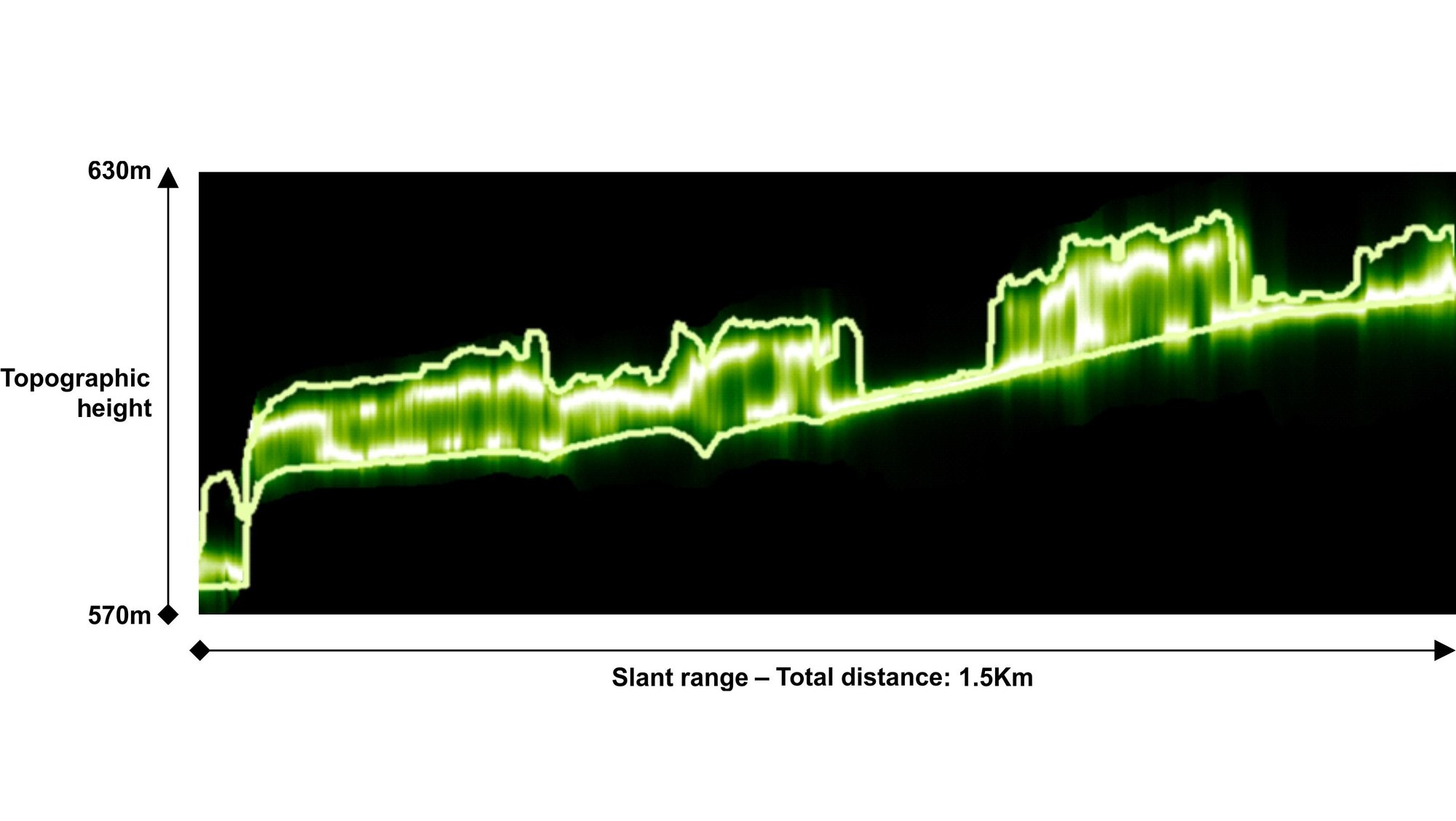 Testgebiet Traunstein: Beispiel für ein vertikales Profil der Radarrückstreuung dieses Waldgebiets. Die Rückstreuung ist in Grüntönen skaliert, von dunkelgrün (geringe Rückstreuung) bis weiß (hohe Rückstreuung). Die durchgezogenen Linien stellen die Höhen von Waldboden und -krone, bestimmt durch Lidarmessungen, dar.