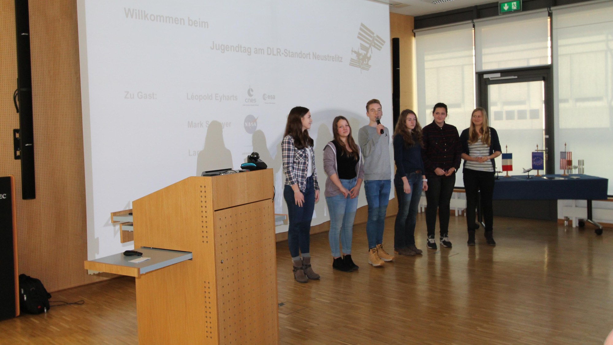Schülerinnen und Schüler des Gymnasiums Carolinum Neustrelitz während der französischen Begrüßung von Léopold Eyharts