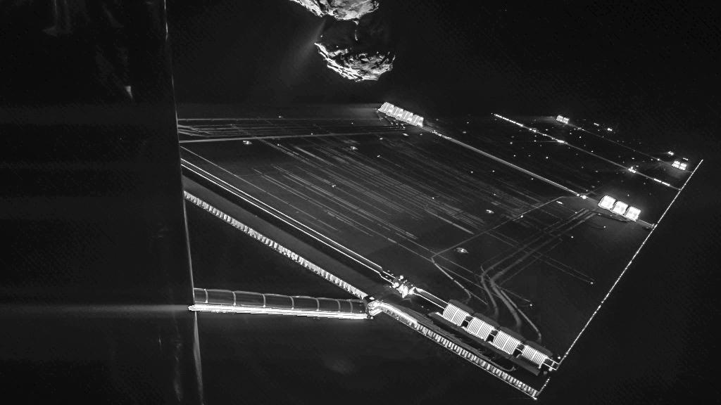Blick vom Lander "Philae" über eines der Solarpanels des ROSETTA-Orbiters hinweg auf den Kometen 67P/Churyumov-Gerasimenko.