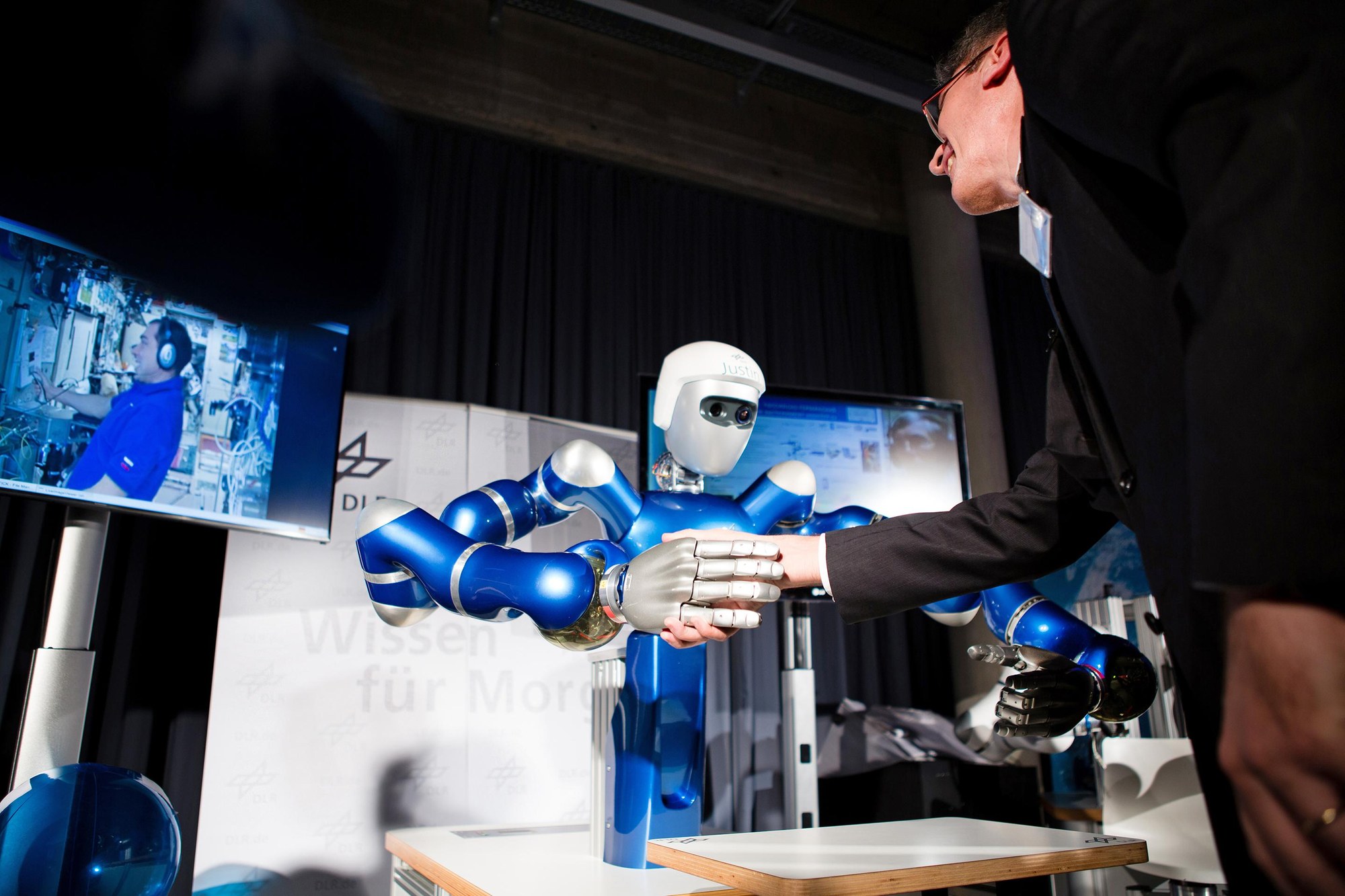 Kosmonaut Sergei Volkov an Bord der ISS und DLR-Institutsdirektor Prof. Dr. Alin Albu-Schäffer schütteln sich in Oberpfaffenhofen die Hand - mittels des humanoiden DLR-Roboters SpaceJustin. Am 17. Dezember 2015 wurde erstmals ein humanoider Roboter aus dem Weltall ferngesteuert.