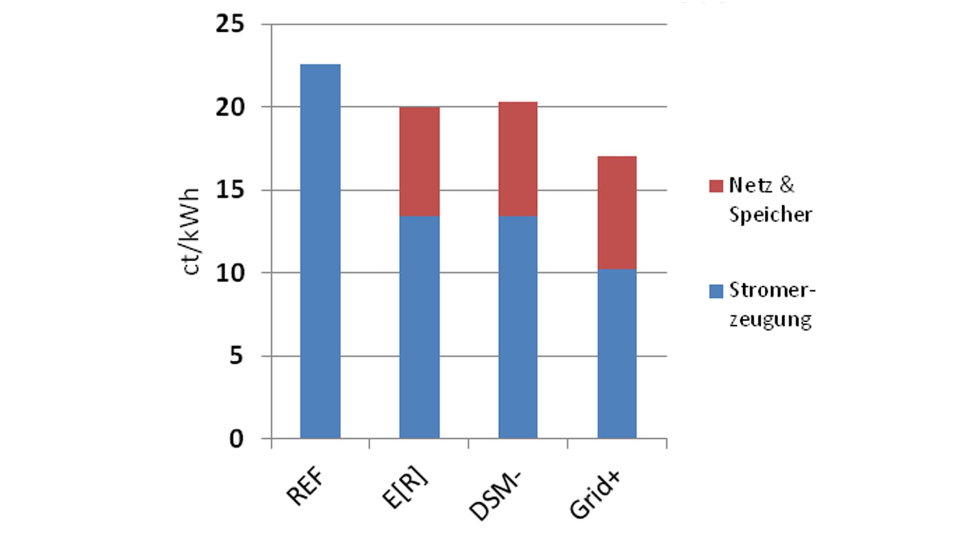 Stromgestehungskosten im Jahr 2050 für das Referenzszenario sowie für die drei Subszenarien - Basis, DSM- und Grid+ - des Energy [R]evolution Szenarios