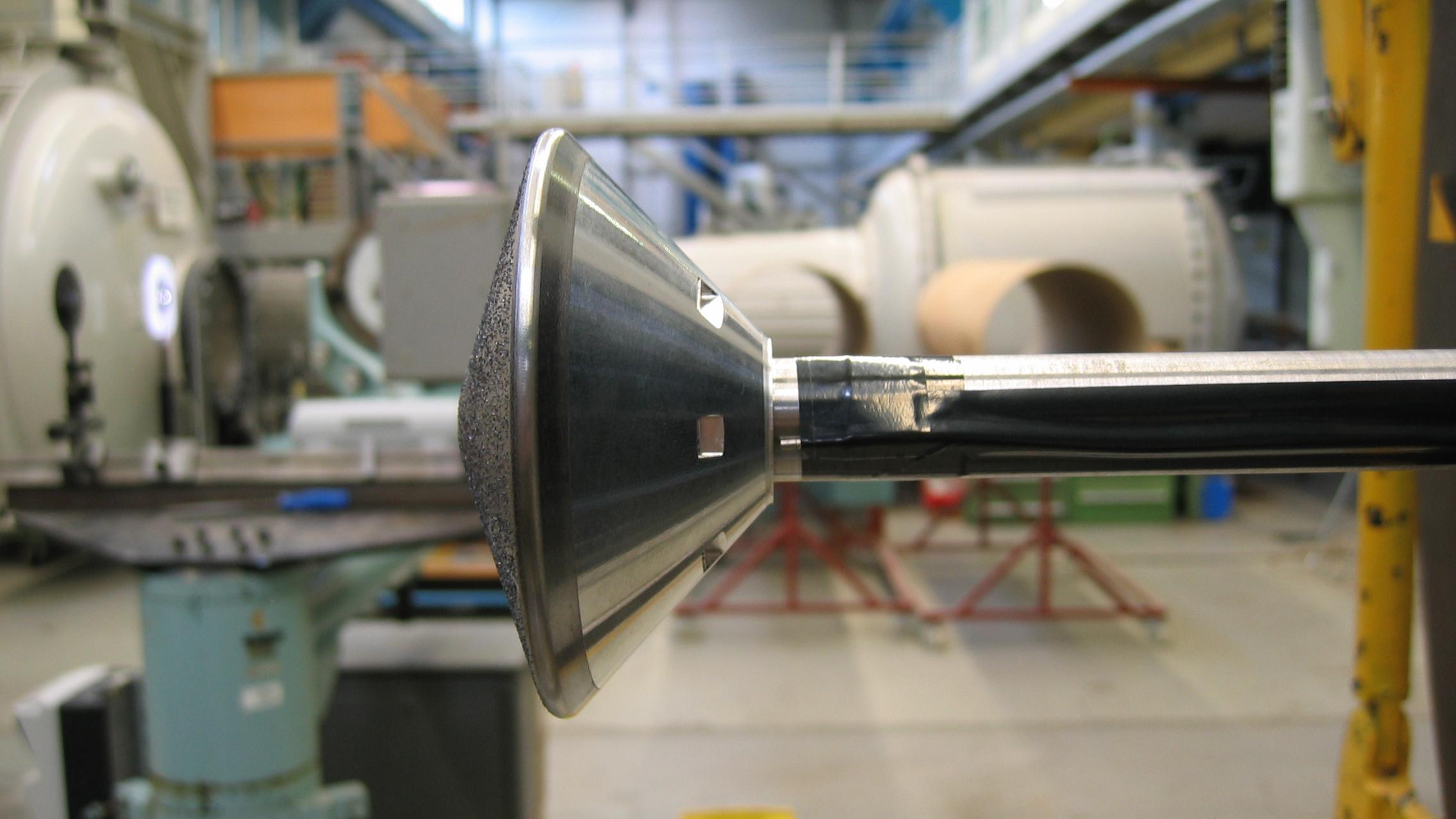 Ein Modell von Schiaparelli im Maßstab von 1:24 wurde auch im trisonischen Windkanal in Köln untersucht. Die raue Oberfläche an der Wiedereintrittsseite ist in dem Modell besonders gut zu erkennen. Die Messdaten dieser umfangreichen Experimente zur aerodynamischen Stabilität der Kapsel spielen für die sichere Landung von Schiaparelli eine entscheidende Rolle.
