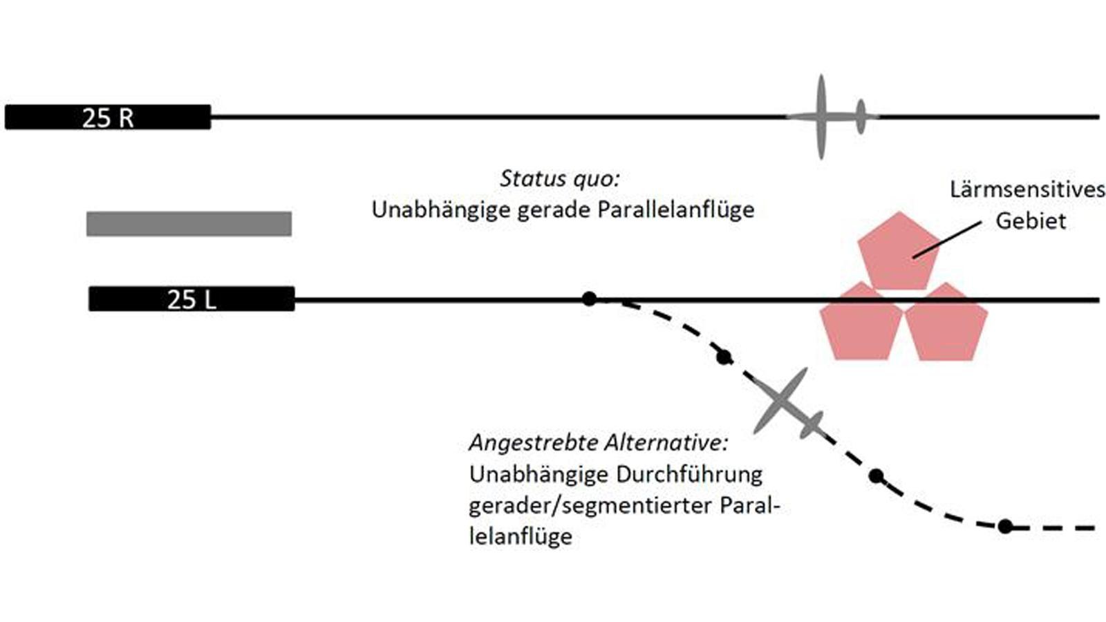 Bereits heute gibt es die Möglichkeit, den Frankfurter Flugverkehr in den verkehrsarmen Randzeiten um dicht besiedelte Siedlungsschwerpunkte herum zu lenken. Das DLR untersucht, nun wie sich der segmentierte Anflug zur Lärmentlastung von dichtbesiedelten Siedlungsschwerpunkten, von den verkehrsarmen Randzeiten auf weitere Tageszeiten mit mehr Flugverkehr übertragen lässt.