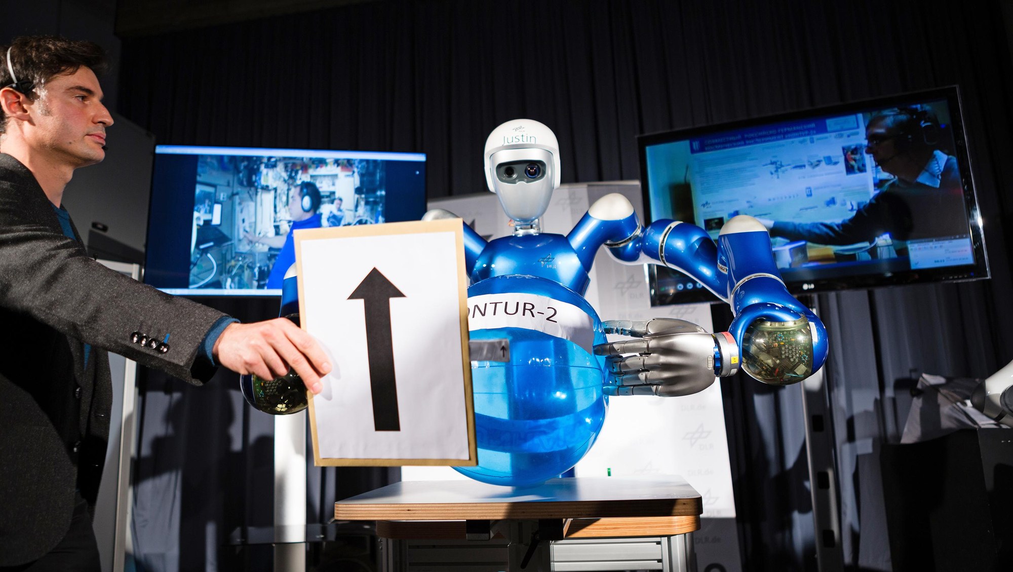 Bei einem kooperativen Telepräsenz-Experiment in Oberpfaffenhofen griff DLR-Roboter SpaceJustin einen Ball und bewegte ihn. Dabei wurde der rechte Roboterarm von der ISS und der linke Roboterarm von St. Petersburg aus gesteuert. Beide Seiten nutzten dafür einen Kontur-2 Joystick des DLR. Das Kontur-2 Team des DLR-Institut für Robotik und Mechatronik koordinierte den Ablauf des Experiments.