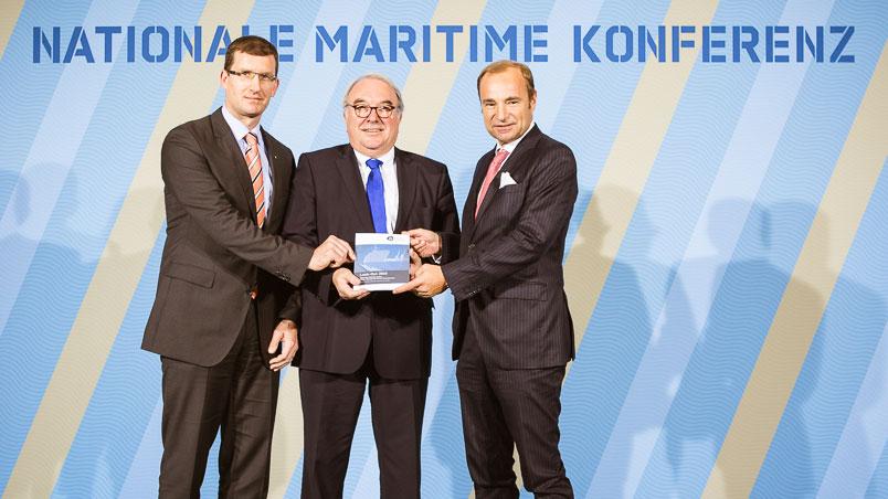 Herr Dr. Dennis Göge (links), Programmkoordinator Sicherheitsforschung des DLR und Christoph Enge (rechts), geschäftsführender Gesellschafter der Lampe und Schwartze Group, übergeben die Broschüre zum Thema Maritime Cyber an den Parlamentarischen Staatssekretär Uwe Beckmeyer, maritimer Koordinator der Bundesregierung im Bundesministerium für Wirtschaft und Energie (BMWi).