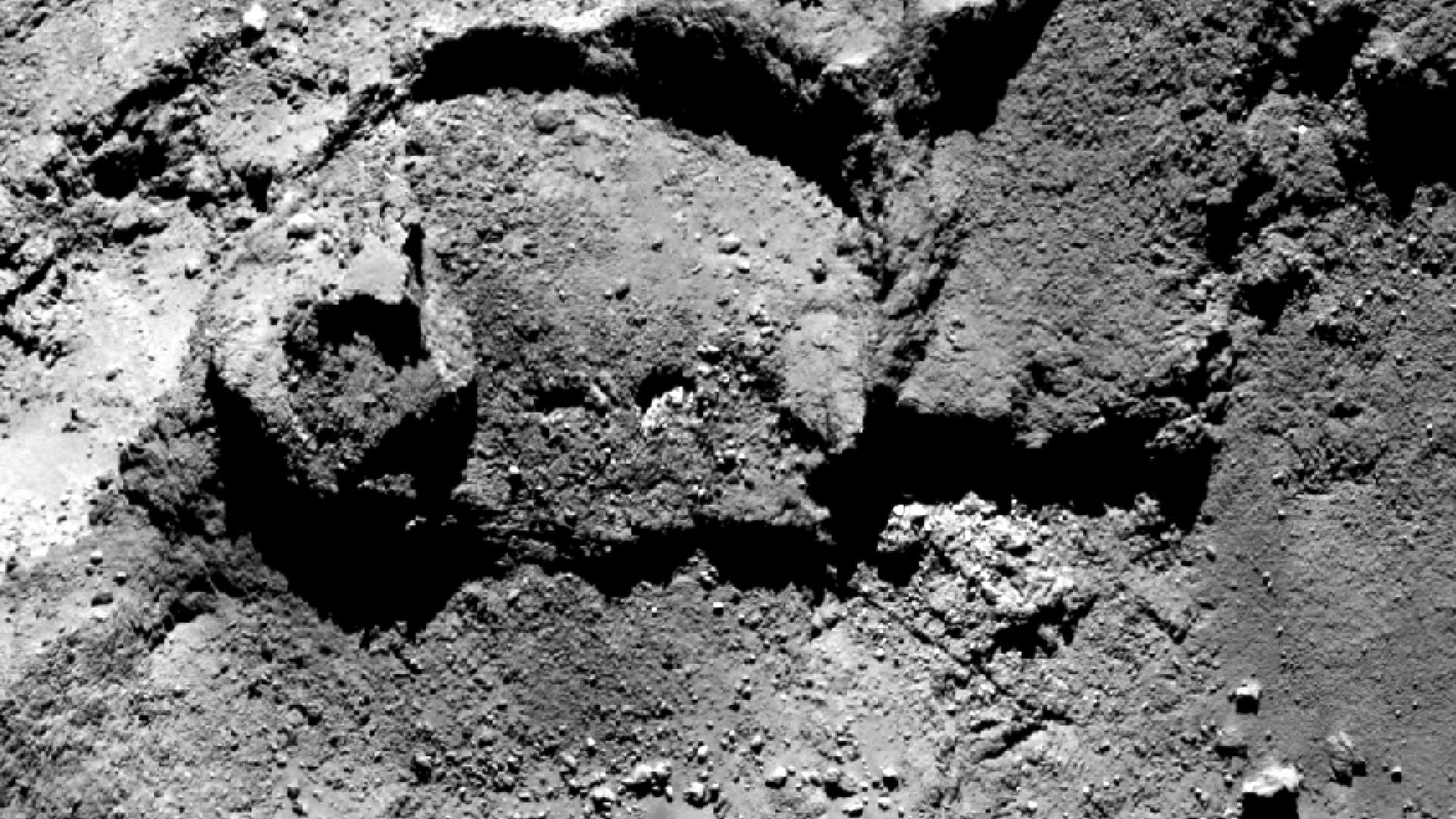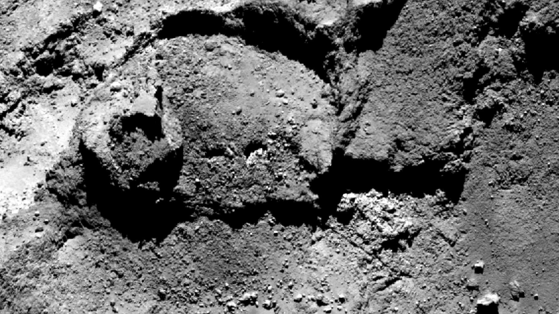Entlang des unteren, abgebrochenen Randes dieser halbkreisförmigen, etwa 300 Meter großen Struktur am Rand der Region Imhotep auf dem Kometen Churyumov-Gerasimenko befindet sich eine der Stellen, an denen Wassereis auf der Kometenoberfläche nachgewiesen wurde. Vermutlich wurde es durch Erosionsprozesse freigelegt.