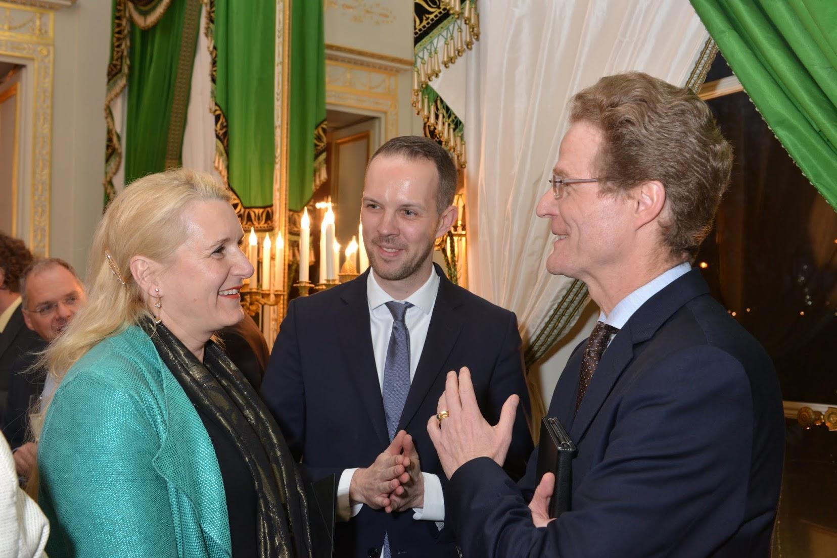 Die DLR-Vorstandsvorsitzende Frau Prof. Dr. Pascale Ehrenfreund zusammen mit Dr. Nikolaus Meyer-Landrut, dem Botschafter der Bundesrepublik Deutschland (rechts), sowie David Musial, Mitarbeiter im Wissenschaftsreferat der deutschen Botschaft