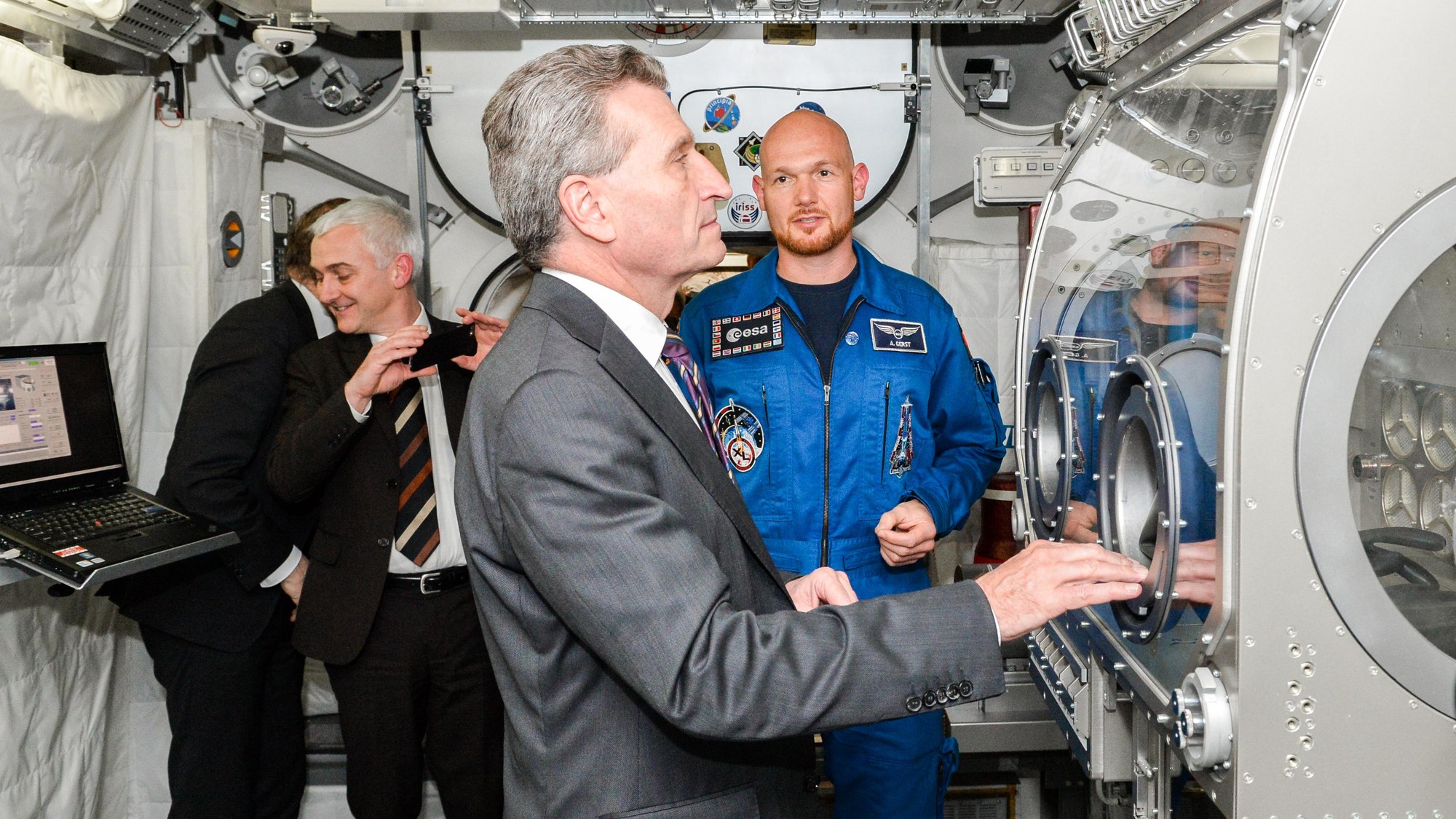 Von der Arbeit als Astronaut konnte sich Günther Oettinger während seines Besuchs in der Astronauten-Trainingshalle ein Bild machen. Der deutsche ESA-Astronaut Alexander Gerst berichtete ihm von seinen Erfahrungen.
