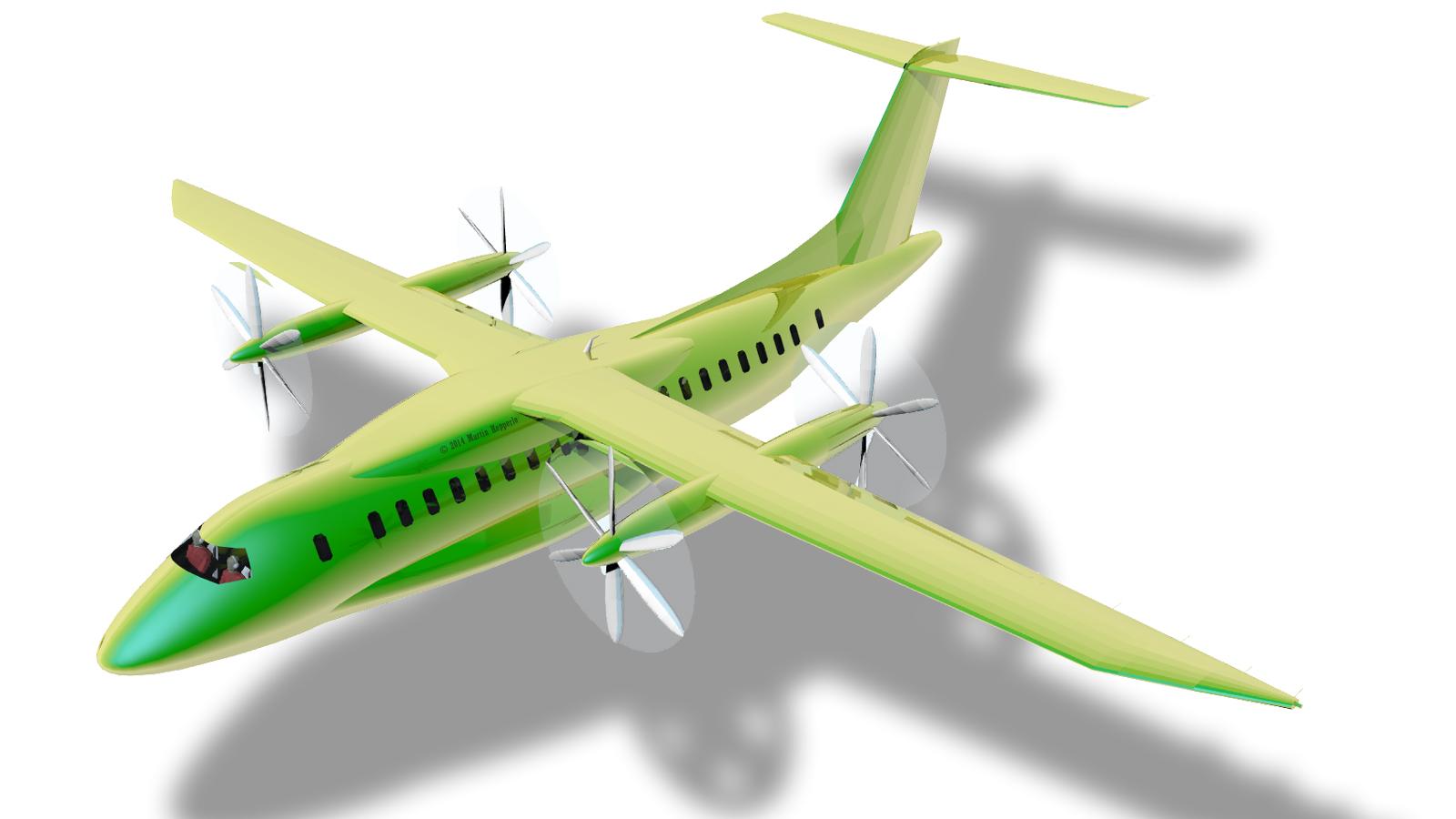 Sieht so das Flugzeug der Zukunft aus? Konzept eines elektrisch angetriebenen zukünftigen Regionalflugzeugs mit geringstem Energieverbrauch.