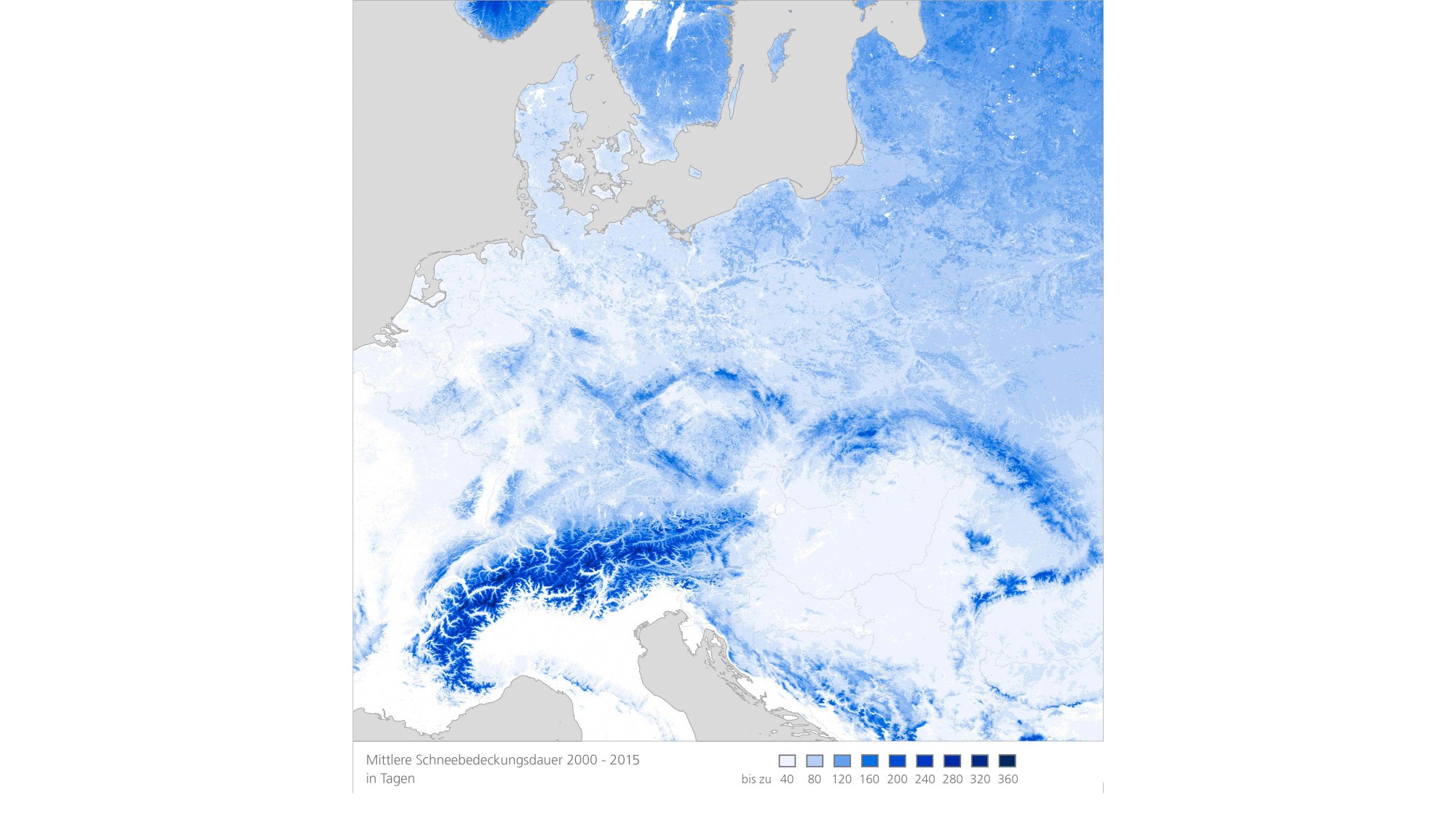 Das Team vom Erdbeobachtungszentrum (EOC) in Oberpfaffenhofen hat Daten bis zum Jahr 2000 ausgewertet. Dabei konnte ein statistischer Mittelwert der Schneebedeckungsdauer für nahezu den gesamten Globus ermittelt werden. Die Karte zeigt die mittlere Schneebedeckungsdauer für Mitteleuropa. Je dunkler das Blau wird, desto länger liegt in diesen Gebieten der Schnee.