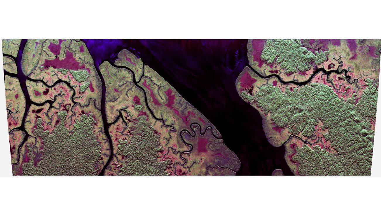 Im Pongara-Nationalpark gibt es noch große Flächen unberührten Mangrovenwalds, der weiter im Landesinneren an dichten Regenwald angrenzt. Die Farbgestaltung spiegelt unterschiedliche Arten der Rückstreuung des Radarsignals wider. Werden die Signale im L-Band (23cm Wellenlänge) vorwiegend von vegetationsfreien Oberflächen (z.B. Wasser, freie Felder) reflektiert, erscheinen sie im Bild blau. Eine überwiegende zweifache Rückstreuung (z.B. an den vertikalen Mangrovenstämmen und der Wasseroberfläche) wird rot angezeigt. Und eine vorherrschend ungerichtete Rückstreuung, insbesondere aus dem Volumen der Baumkrone des Regenwalds erscheint grün.