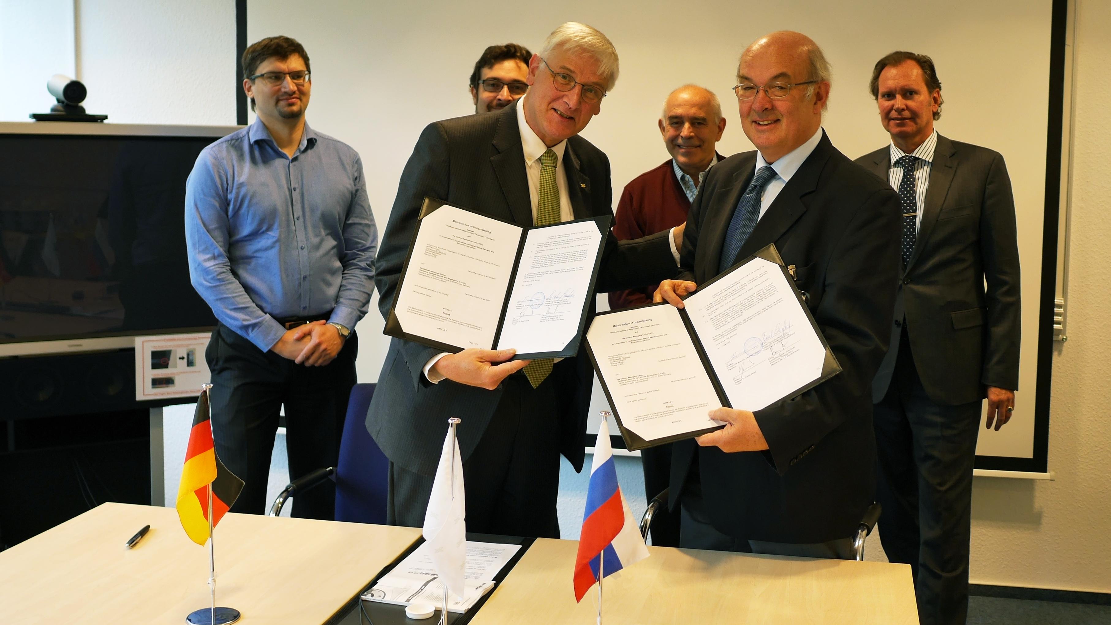 Am 13. Juni 2016 unterschrieben der DLR-Raumfahrtvorstand Prof. Hansjörg Dittus (vorne l.) und der Provost des russischen "Skolkovo Institute of Science and Technology" (SkolTech), Prof. Rupert Gerzer (vorne r.), einen Rahmenvertrag zur Stärkung der Zusammenarbeit. In der hinteren Reihe: v. l. n. r. Prof. Dzmitry Tsetserukou, Prof. Alessandro Golkar und Prof. Evgeni Nikolaev von der SkolTech-Universität sowie Prof. Andreas Rittweger, Leiter des DLR-Instituts für Raumfahrtsysteme.