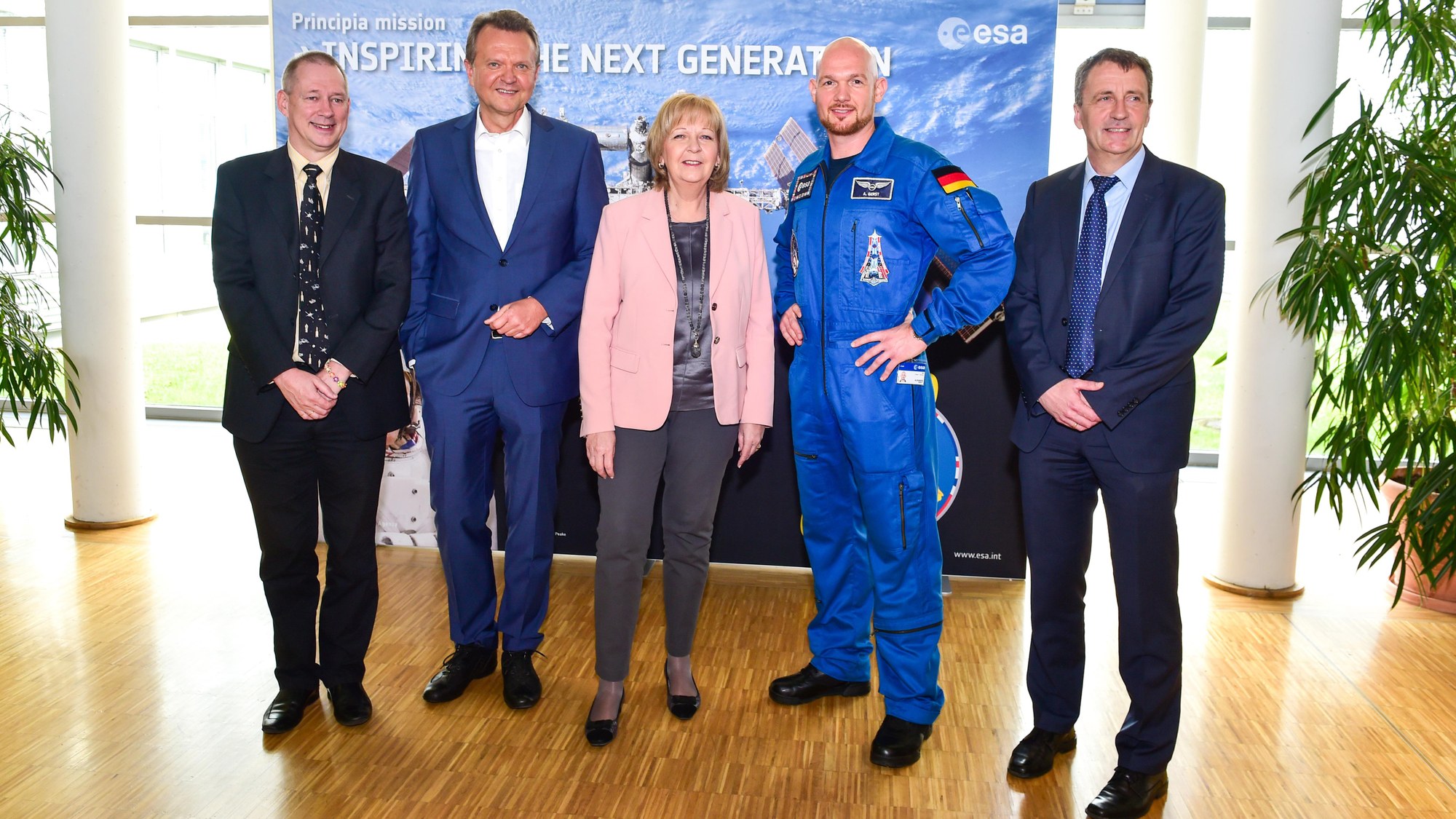 Am 4. Mai besuchte die Ministerpräsidentin das Europäische Astronautentrainingszentrum (EAC) der ESA und das DLR in Köln. Von links nach rechts: Frank De Winne, Leiter des EAC, Martin Dörmann, SPD-Bundestagsabgeordneter, Hannelore Kraft, NRW-Ministerpräsidentin, Alexander Gerst, deutscher ESA-Astronaut, Klaus Hamacher, stellvertretender Vorsitzender des DLR-Vorstands.