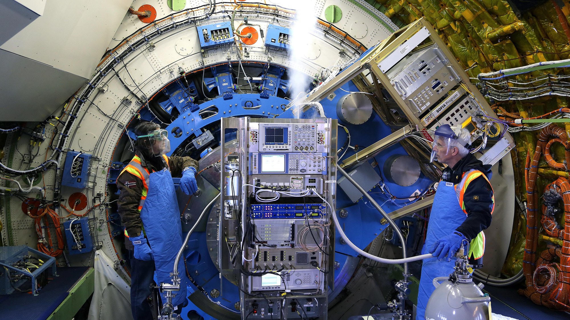 Das Instrument GREAT (German Receiver for Astronomy at Terahertz Frequencies) ermöglicht Beobachtungen im Ferninfrarot-Bereich. Das Gerät (metallfarbene, rechteckige Konstruktion rechts im Bild) wurde in Deutschland entwickelt und gebaut. Damit das Instrument im vorgesehenen Infrarotbereich beobachten kann, muss der Sensor heruntergekühlt werden. Dies geschieht mit Hilfe von flüssigem Stickstoff und Helium. Beim Einfüllen muss Schutzkleidung getragen werden, um Verletzungen beim Umgang mit den eiskalten Substanzen zu vermeiden.