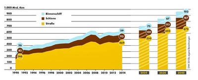 Diese Abbildung zeigt die historische Entwicklung der Güterverkehrsleistung in Deutschland von 1990 bis 2014 mit anschließender Prognose bis zum Jahr 2040. Die Güterverkehrsleistung von Binnenschiff-, Schienen- und Straßenverkehr ist in Milliarden Tonnenkilometern angegeben (Quelle: Shell-Nutzfahrzeugstudie 2016).