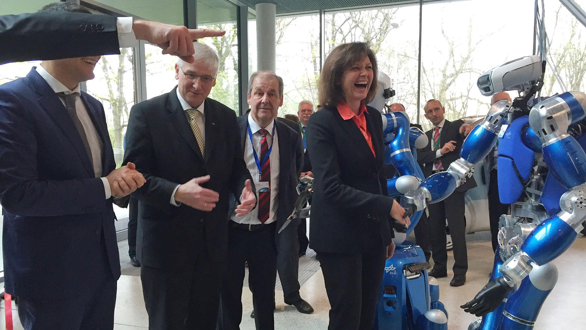 Die bayerische Staatsministerin Ilse Aigner beim Shakehands mit TORO, einem weiteren humanoiden Roboter am RMC, dem Robotik und Mechatronik Zentrum in Oberpfaffenhofen.