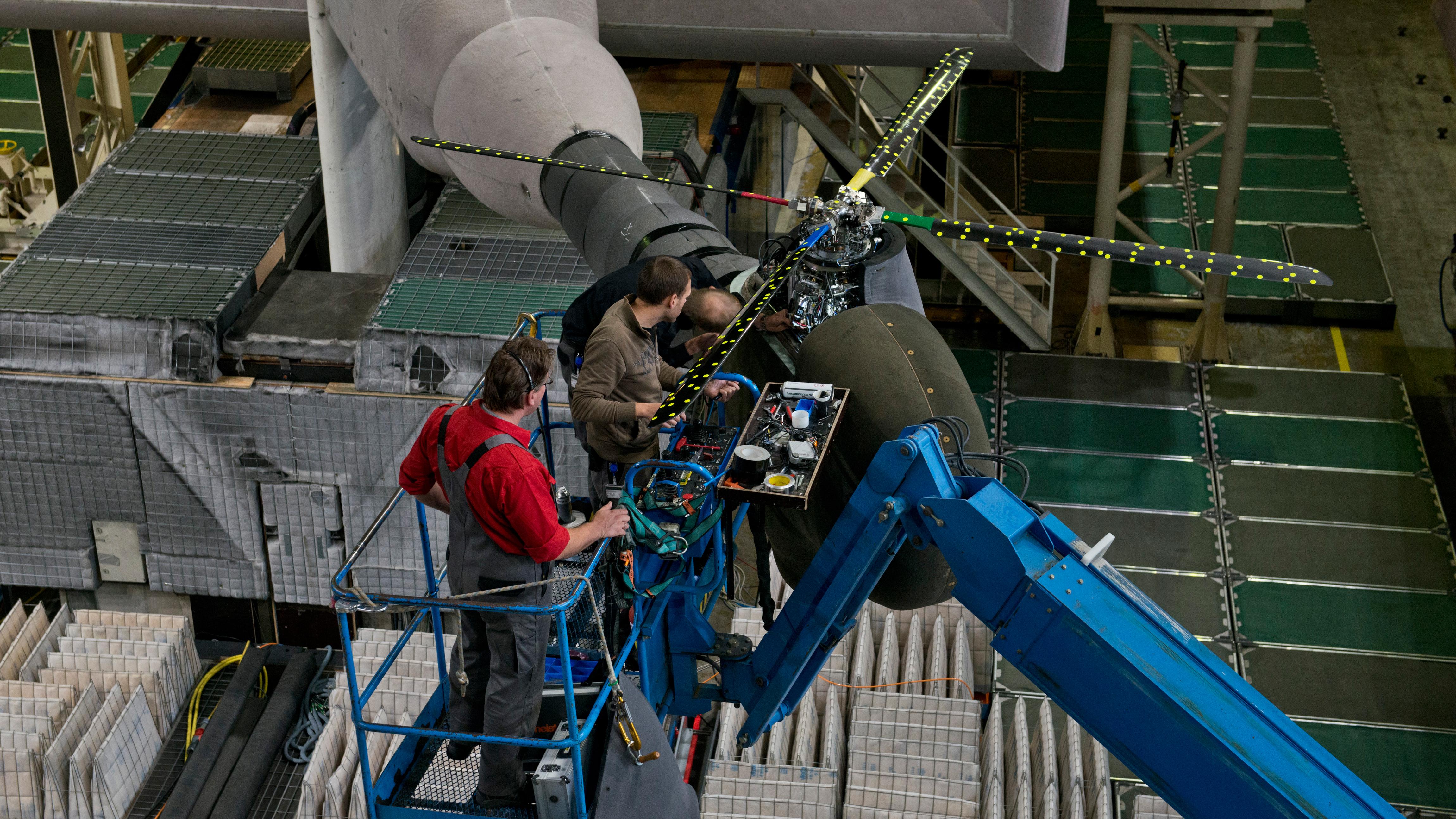 In fast 7 Metern Höhe überprüfen Wissenschaftler das Modell im Windkanal.