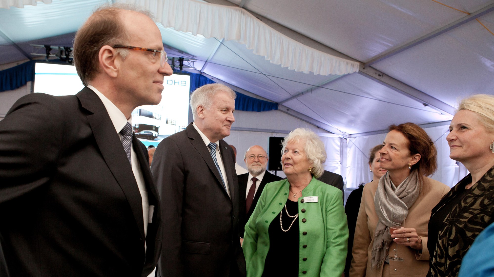 Das neue Zentrum für Optische Systeme und Wissenschaftsmissionen ergänzt die Kompetenzen des Wissenschaftsstandorts Oberpfaffenhofen. Bei der Eröffnung kamen die neuen Nachbarn miteinander ins Gespräch. Von links nach rechts: Marco Fuchs, Vorstandsvorsitzender OHB SE, Horst Seehofer, Ministerpräsident des Freistaates Bayern, Christa Fuchs, Vorsitzende des Aufsichtsrats der OHB SE, Romana Fuchs Mayrhofer, Stellvertretende Vorsitzende des Aufsichtsrats der OHB System AG, Prof. Dr. Pascale Ehrenfreund, Vorstandsvorsitzende des DLR.