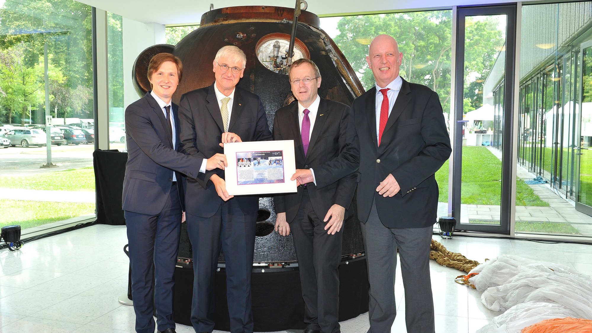 v.l.n.r.: Dimitri Koroljow, Vizekonsul im Russischen Generalkonsulat, DLR-Raumfahrtvorstand Prof. Hansjörg Dittus, ESA-Generaldirektor Prof. Johann-Dietrich Wörner, DLR-Raumfahrtmanagement-Vorstand Dr. Gerd Gruppe vor der Sojus-Kapsel.