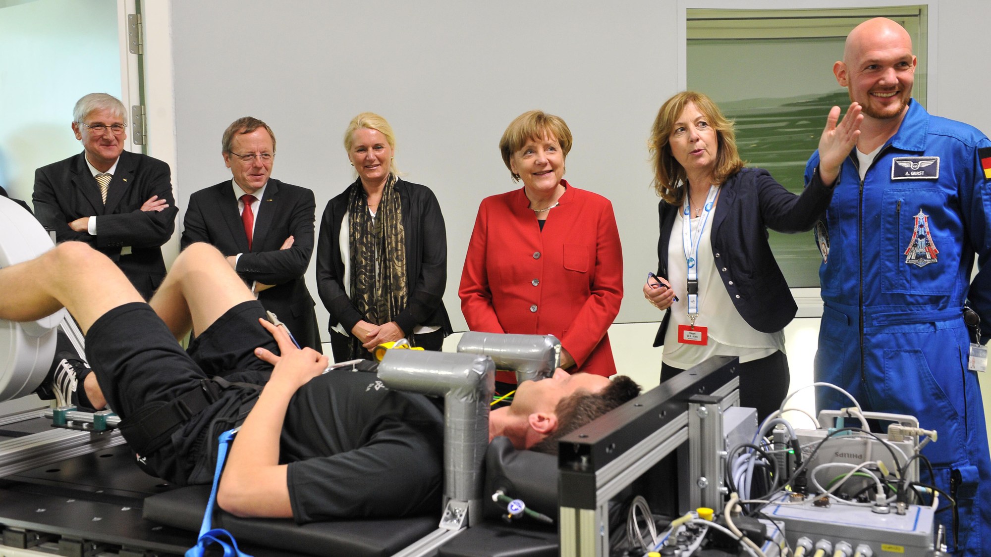 Biologin Ruth Hemmersbach stellt Bundeskanzlerin Merkel das Trainig in der Zentrifuge im :envihab vor. V.r.n.l: Prof. Hansjörg Dittus, DLR-Vorstand Raumfahrtforschung, Prof. Jan Wörner, ESA-Generaldirektor, Prof. Pascale Ehrenfreund, DLR-Vorstandsvorsitzende, Bundeskanzlerin Angela Merkel, Dr. Ruth Hemmersbach, Leiterin Gravitationsbiologie, Alexander Gerst, ESA-Astronaut.